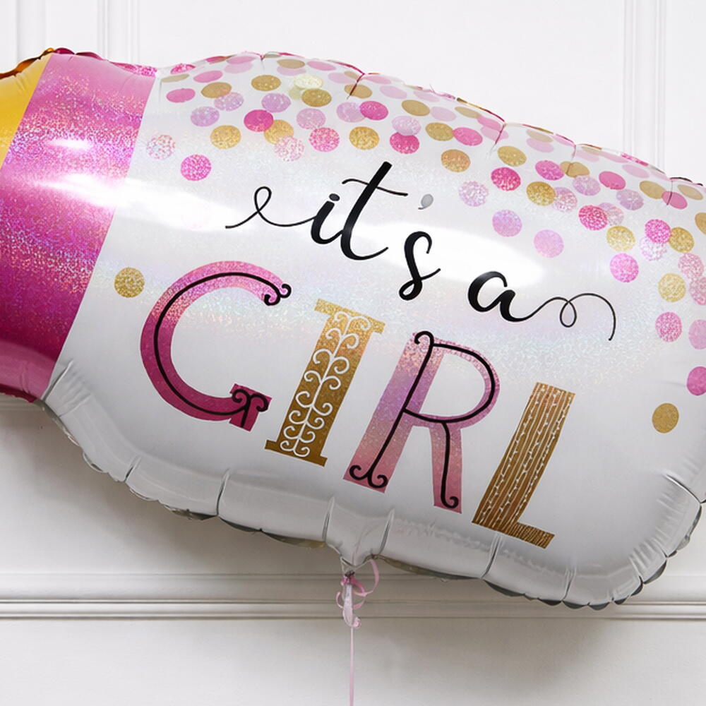 Cute bottle shape balloon perfect for baby girl welcome and baby shower decoration. Helium filled balloon lasts approximately 8 to 10 hours.