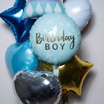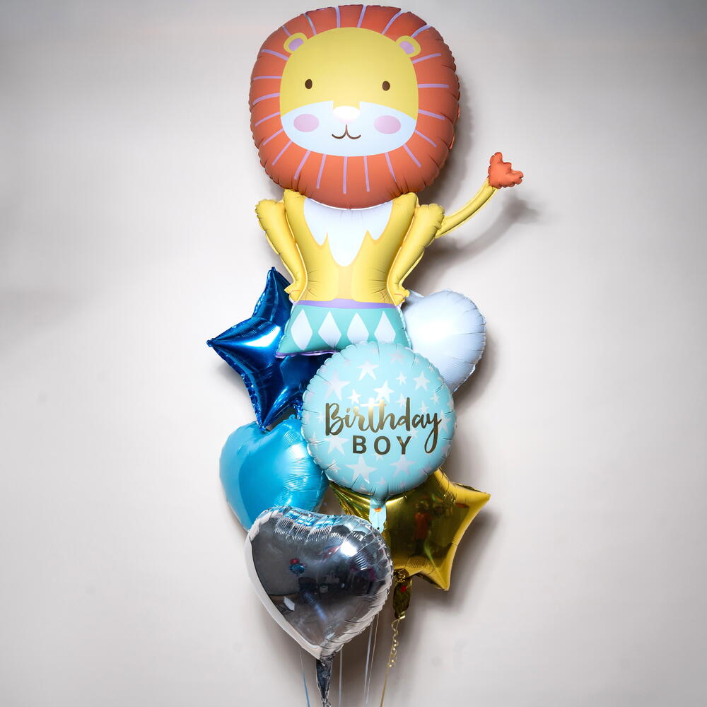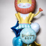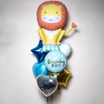 King Lion Birthday Boy Foil Balloon Set (7 Balloons) – Premium party decoration set with 1 big King Lion foil balloon, 1 “Birthday Boy” round foil balloon, 2 star foil balloons (gold blue), and 3 heart foil balloons (white, silver light blue). Styled in an elegant blue, gold, silver and white theme, perfect for baby boy birthdays, first birthdays, kids parties, jungle or animal theme celebrations, home décor and photo backdrops.