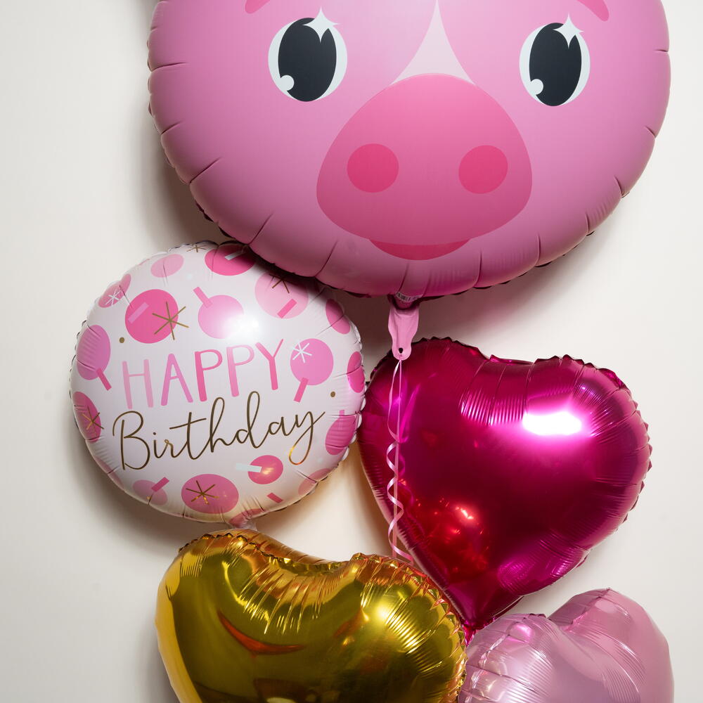 This Pink Pig Theme Happy Birthday Foil Balloon Set (5 balloons) adds a cute and cheerful touch to any birthday celebration. The set features 1 large pink pig face foil balloon, 1 round “Happy Birthday” foil balloon, and 3 heart-shaped foil balloons in pink, gold, and deep pink for a charming layered look. Perfect for kids’ birthdays, room décor, and photo moments, this 5-piece foil balloon set creates a sweet and festive atmosphere and offers a helium float time of approximately 8–10 hours 🎈🐷