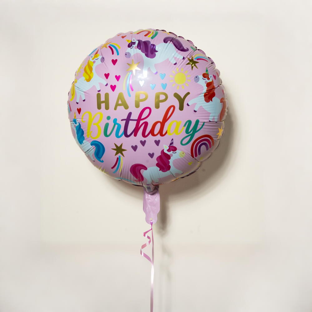 Bring a magical and cheerful touch to your celebration with this Happy Birthday Unicorn Foil Balloon. Designed with a soft pastel pink background, colorful rainbows, stars, hearts, and adorable unicorn illustrations, this balloon is perfect for kids’ birthdays, unicorn-themed parties, baby showers, and fantasy-inspired celebrations. Made from high-quality foil material, the balloon features a smooth, glossy finish that keeps its colors vibrant and eye-catching throughout your event. The playful “Happy Birthday” text combined with cute unicorn graphics makes it a delightful decoration and a wonderful photo prop for memorable moments. The balloon is suitable for helium or air inflation and includes a self-sealing valve for easy use. When filled with helium, it floats beautifully and can be paired with a ribbon or balloon weight to keep it securely in place. Helium float time is approximately 8–10 hours, depending on conditions. Use it as a standalone decoration, a centerpiece, or combine it with other balloons to create a charming unicorn or birthday-themed balloon arrangement.
