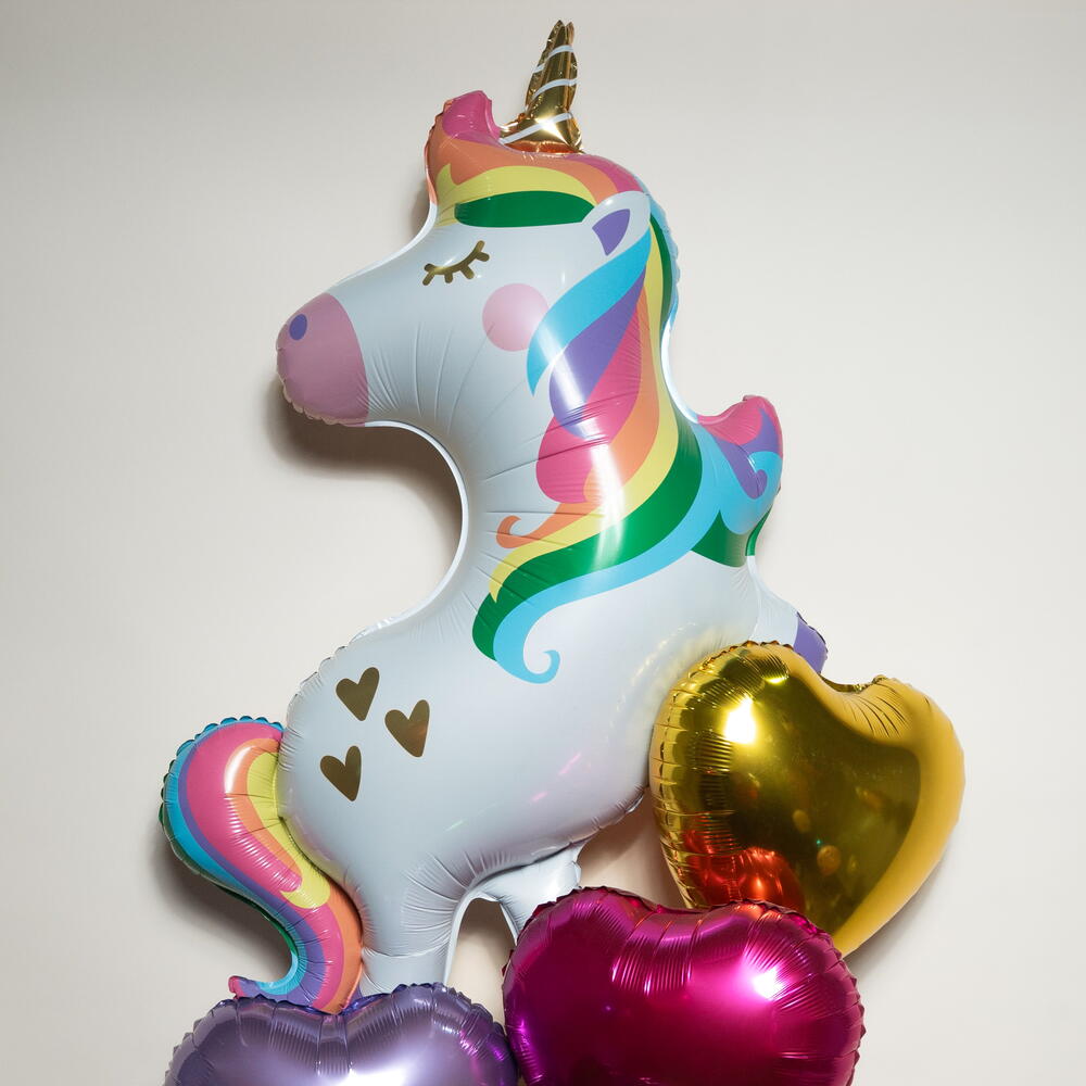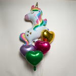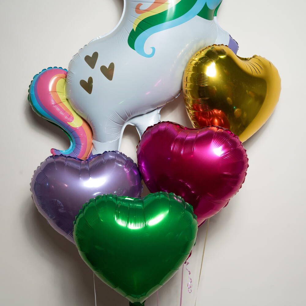 Celebrate magic and joy with this Rainbow Unicorn Hearts Foil Balloon Set (5 balloons), perfect for birthdays, kids’ parties, and unicorn-themed celebrations. This charming helium balloon arrangement features 1 rainbow unicorn foil balloon paired with 4 heart-shaped foil balloons in gold, pink, purple, and green, creating a bright and enchanting display. Perfect for party décor, room styling, and fun photo moments, this 5-piece foil balloon set offers a helium float time of approximately 8–10 hours, making it ideal for same-day celebrations. A delightful way to add sparkle and unicorn magic to any special occasion 🦄🎈