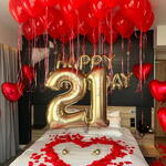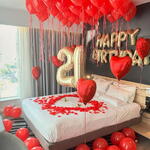 Customaizqble bedroom setup - happy birthday or happy Anniversary/ love foil balloons -number foil balloons - 6 heart shaped balloons -50 balloons on floor - 50 helium balloons for ceiling -rose petal heart on bed / initials of names