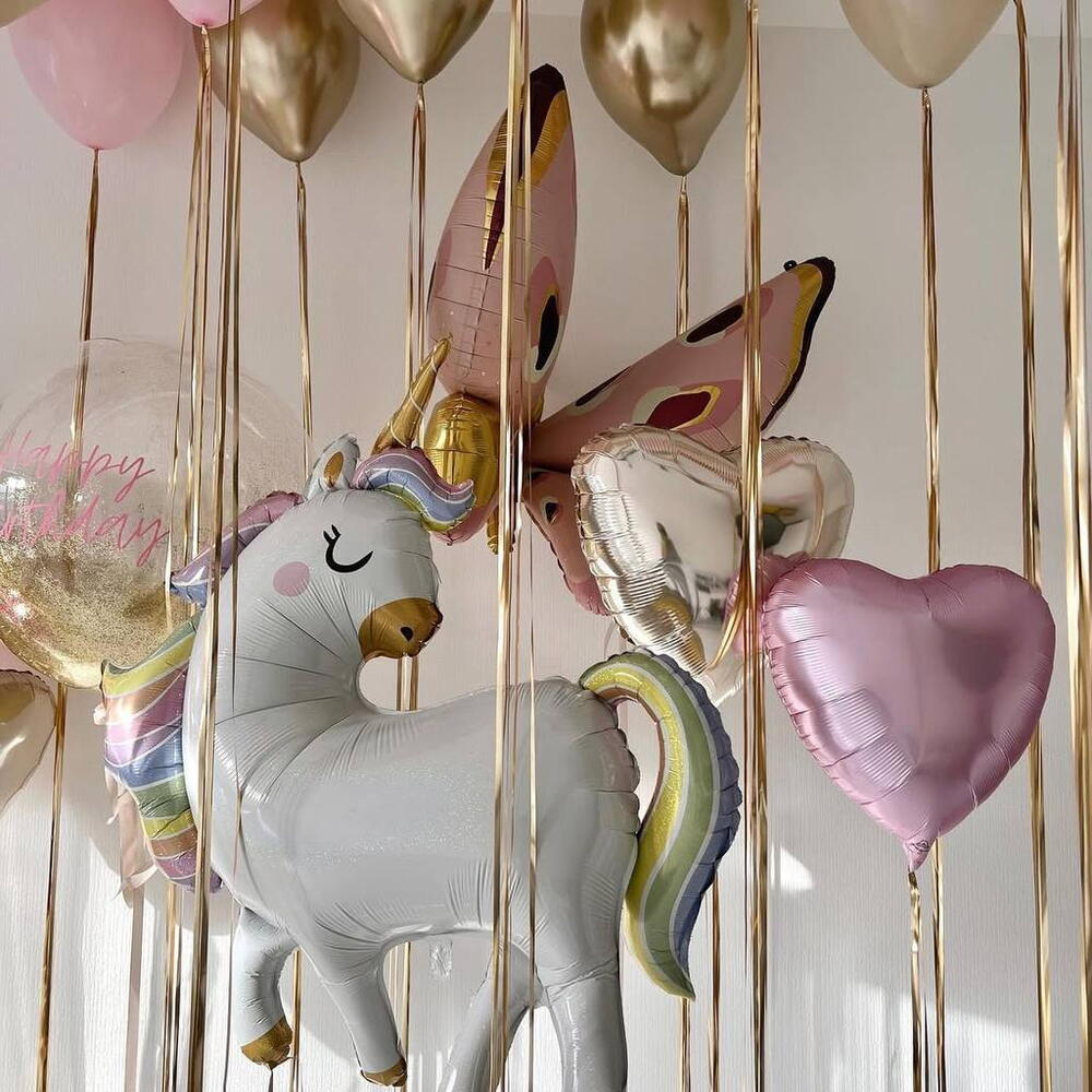 The well-shaped and unique-designed Unicorn balloon combined with a several of suitable balloons is going to get attention really fast! The unicorn is a great guest on any party! 1 bubble balloon 24 with gold glitter (hi-float by half), with bright pink inscription, with satin ribbon and satin bow, with weight Under the ceiling: (with gold curtains) 4 latex fashion pink balloons 12 4 latex white sand balloons 12 4 latex chrome gold balloons 12 Each balloon with separate weight, different length of ribbons: 2 foil champagne hearts 18 1 foil satin flamingo heart 18 1 foil butterfly balloon 1 foil unicorn balloon You can change the inscription to your own. Product color may slightly vary due to photographic lighting sources or your monitor settings. All latex balloons are treated with hi-float for long flight. Also, the customer can be offered a replacement for a similar product.