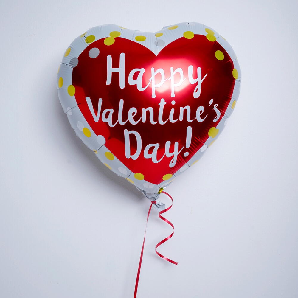 Heart shaped foil balloon with written ‘Happy Valentine’s Day’ filled with helium. Helium will last 6 to 8 hours