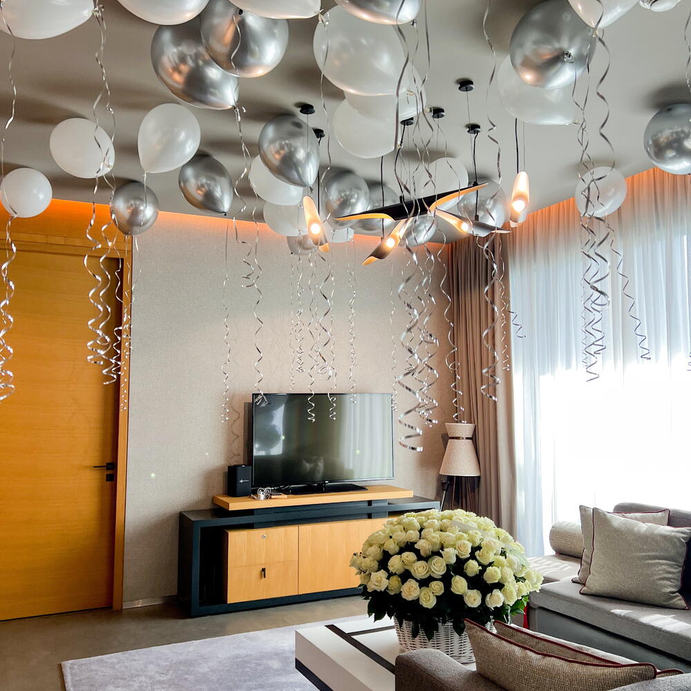 White, silver ceiling balloons