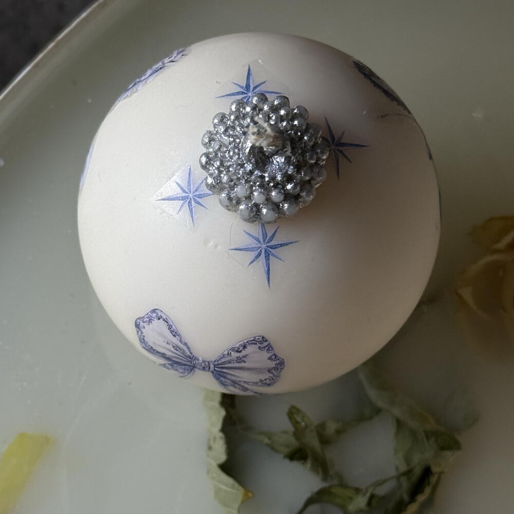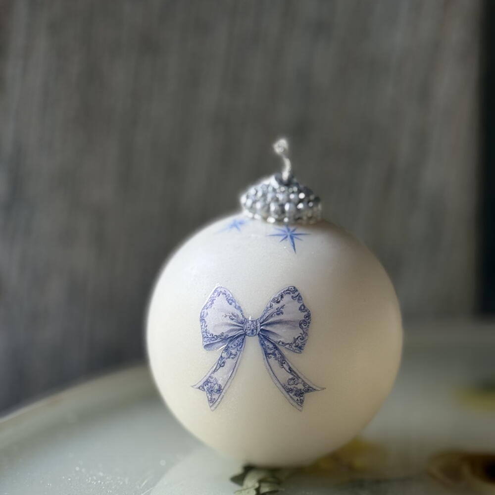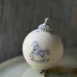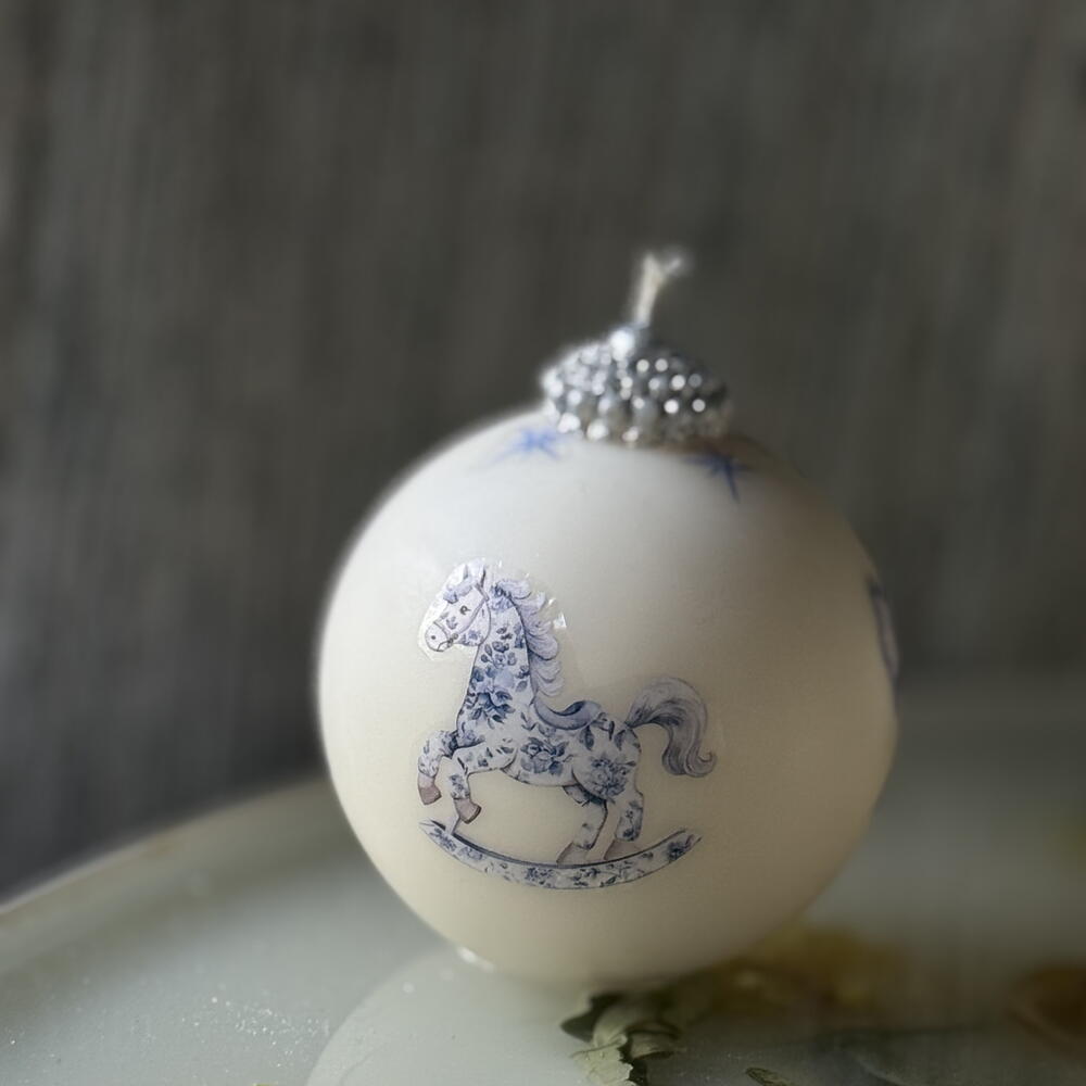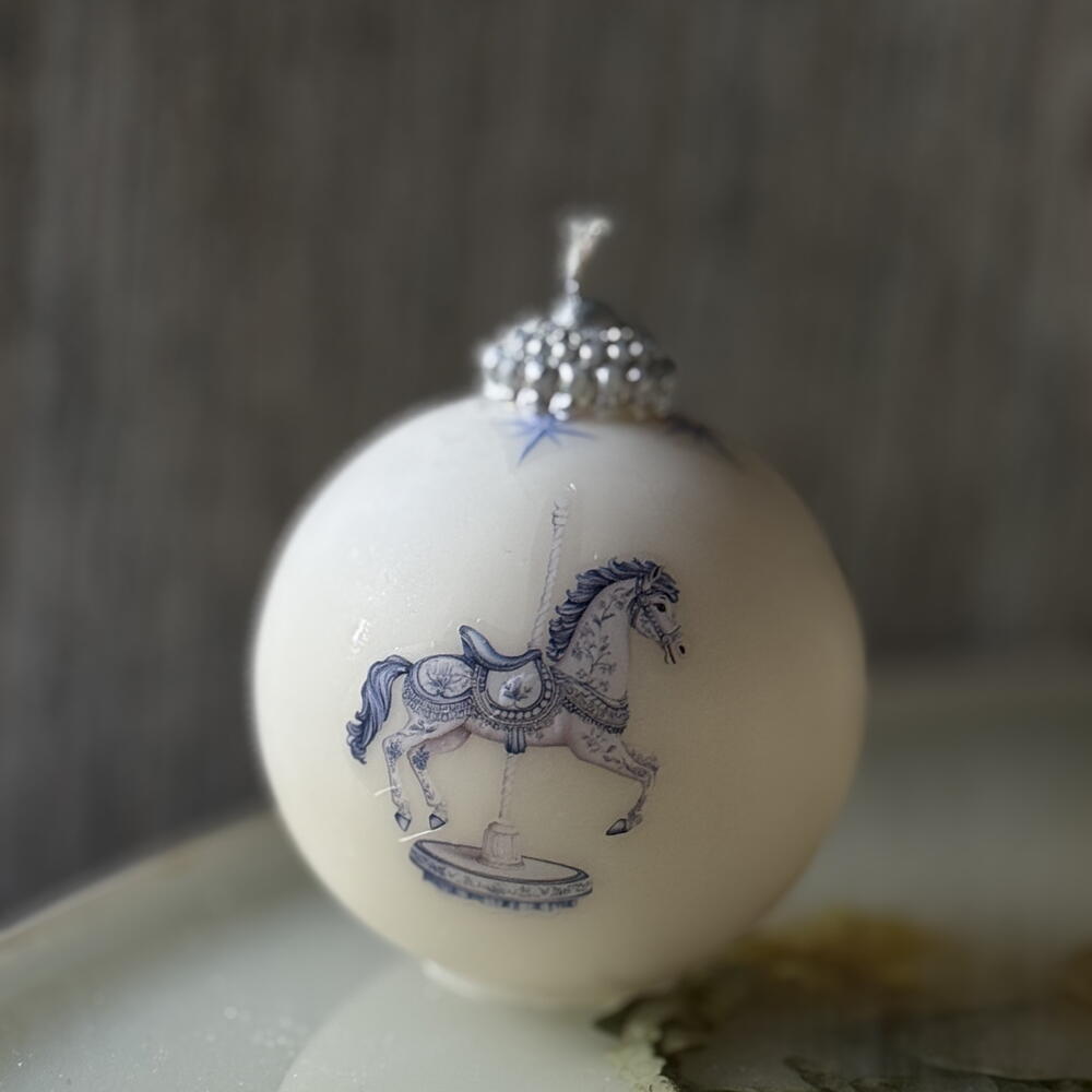 Handcrafted Christmas bauble candle with a delicate blue carousel horse print. Made from premium clean-burning wax and decorated with fine detailing for an elegant, nostalgic holiday look. Perfect for gifting, home decor and adding a magical vintage touch to your Christmas atmosphere. Comes beautifully packaged and ready to gift