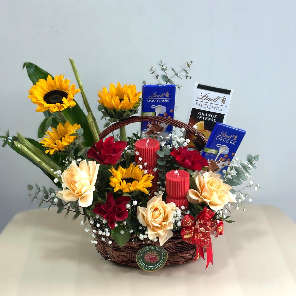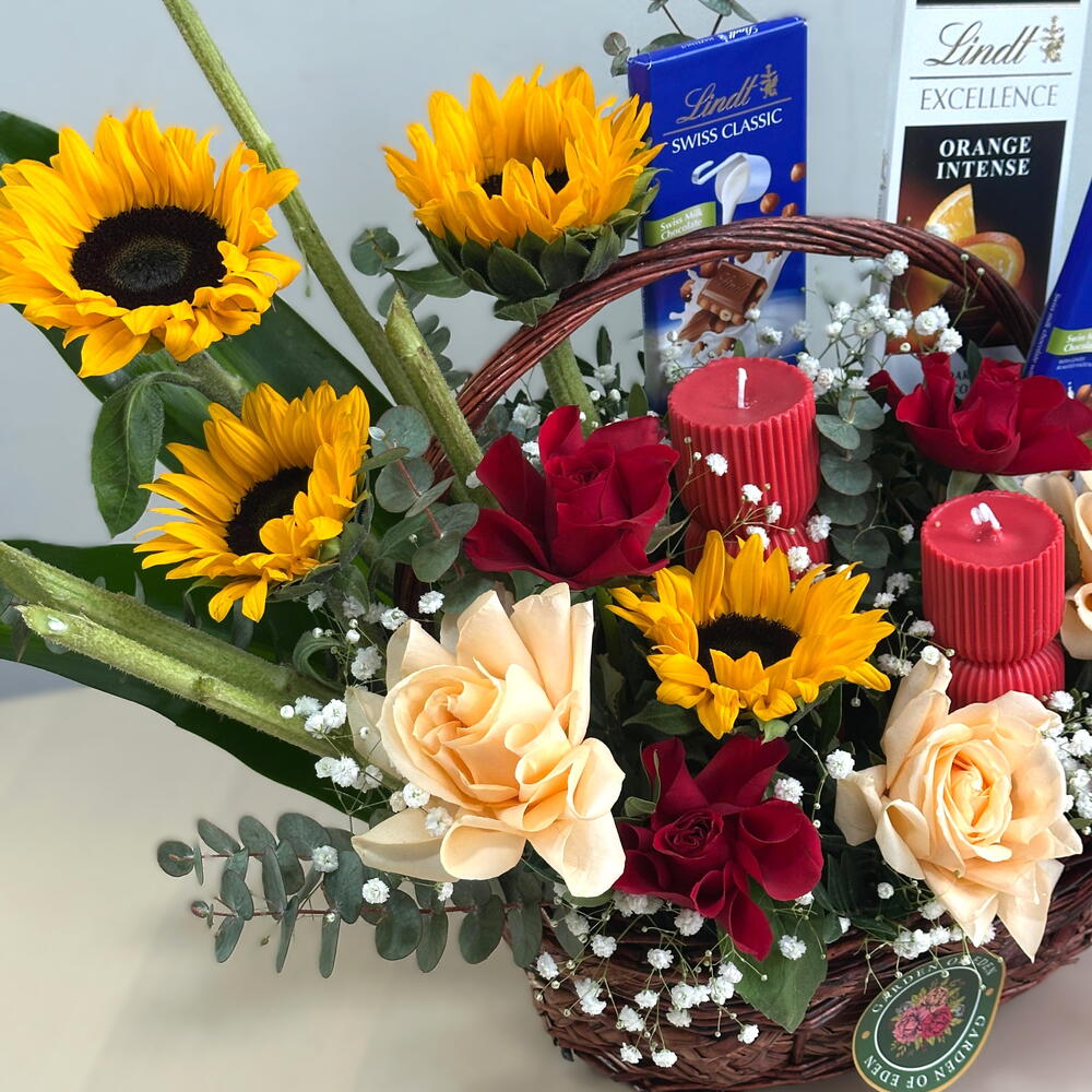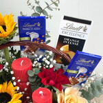 A charming romantic basket arrangement featuring 4 radiant sunflowers, 3 delicate peach roses, and 3 passionate red roses. Paired with indulgent treats, including two Lindt Swiss Classic Milk Chocolate bars (100g each) and a Lindt Excellence Orange Intense Chocolate bar (100g), and complemented by two red scented candles. This basket exudes warmth, love, and sweetness, making it the perfect gift for a romantic celebration.