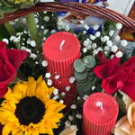 Red rose: 3 Basket: 1 Peach rose: 3 Sun flower: 4 Lindt sississ classic milk chocolate bars (100gm): 2 Lindt excellence orange intense chocolate bar (100g): 1 Red scented candle: 2