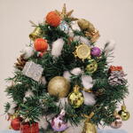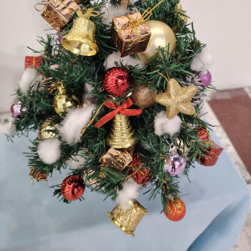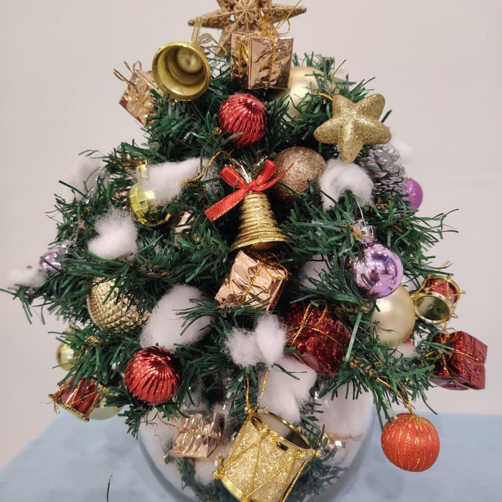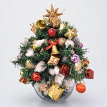 A charming miniature Christmas tree densely decorated with gold, red, and purple ornaments, bells, and a star topper. It is set in a clear glass globe base and features soft white cotton accents, perfect for a festive desk or shelf display.