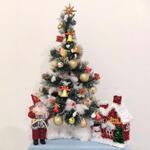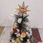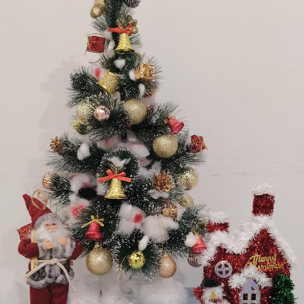 A charming, fully decorated tabletop Christmas tree dusted with snow and adorned with gold and red ornaments, bells, and a star topper. It is accompanied by a Santa figure and a miniature red Christmas cottage for a complete festive centerpiece.