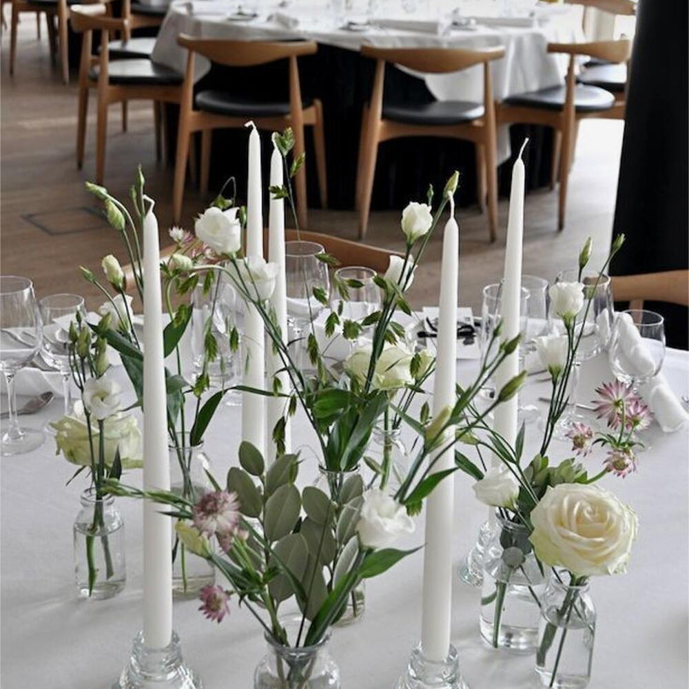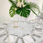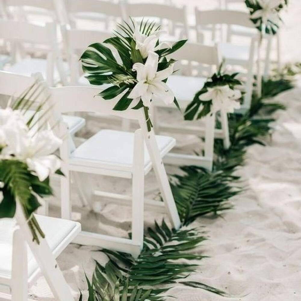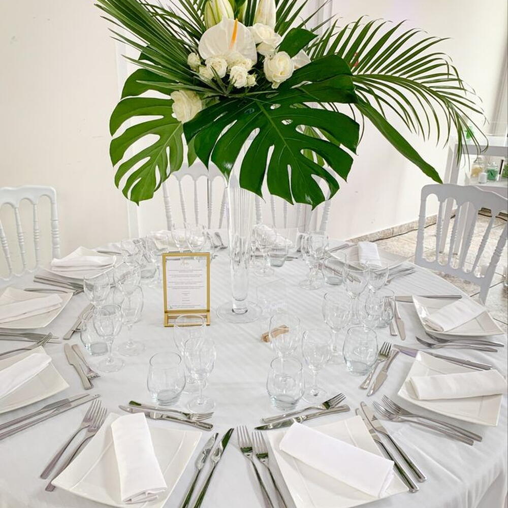 Eustoma white - 30 pcs lily white - 50 pcs hudrangea white - 30 pcs roses white - 150 pcs arch with fresh flowers - 1 pcs decorating one table with mini vases and candles - 5 pcs chair decoration - 5 pcs high complexity for 5 table - 5 pcs munstera leaves - 100 pcs
