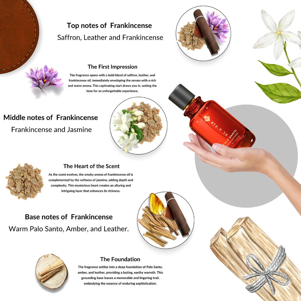 AL AFIR Palo Santo Frankincense Eau de Parfum is a luxurious and captivating unisex fragrance that blends the deep, woody notes of Palo Santo with the resinous richness of frankincense. Enhanced by the bold and luxurious essence of saffron and the warm, leather undertones, this fragrance offers an elegant and sophisticated aroma that is perfect for any occasion. Crafted for both men and women, this 100 ml eau de parfum is long-lasting, ensuring that its luxurious scent lingers throughout the day. Encased in a premium bottle, this artisanal scent makes a thoughtful gift or a beautiful addition to any fragrance collection. Whether for daily wear or special events, the combination of Palo Santo, frankincense, saffron, and leather delivers a bold and memorable olfactory experience.