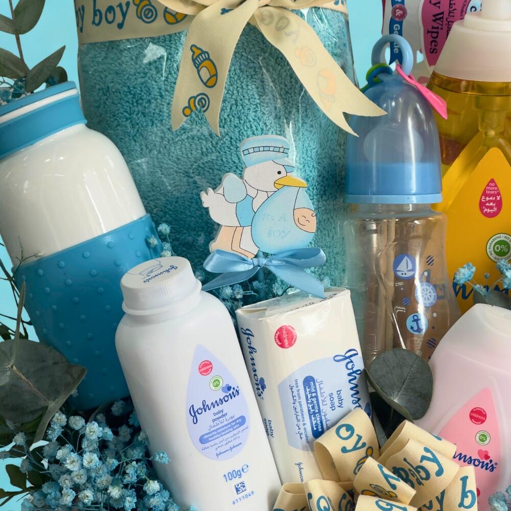A 150ml feeding bottle A soft and absorbent baby bathing towel A sweet baby boy outfit (1 pair) 2 baby soaps (125g each) Johnson’s Baby Shampoo (750ml) Johnson’s Cotton Touch Face Body Lotion (400ml) A pack of 12 gentle baby wipes Johnson’s Baby Powder (100g) Johnson’s Soft Baby Lotion (100ml) A mini light pacifier for comfort An adorable It’s a Boy tag stick A baby water bottle
