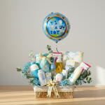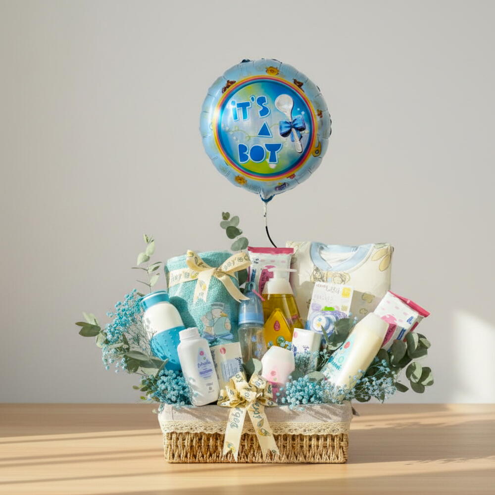 Welcome a little prince with our luxurious Baby Boy Hamper – Large, thoughtfully arranged in a charming basket. This delightful gift set includes a 150ml feeding bottle, a soft baby bathing towel, a baby boy outfit (1 pair), two gentle baby soaps (125g each), Johnson’s Baby Shampoo (750ml), Cotton Touch Face Body Lotion (400ml), Johnson’s Soft Baby Lotion (100ml), baby powder (100g), a pack of 12 baby wipes, and a mini light pacifier. Adorned with delicate gypsophila and eucalyptus, the hamper is finished with a sweet “It’s a Boy” tag stick, a blue baby boy ribbon, and a festive baby boy foil balloon—making it the perfect way to celebrate the arrival of a new bundle of joy.