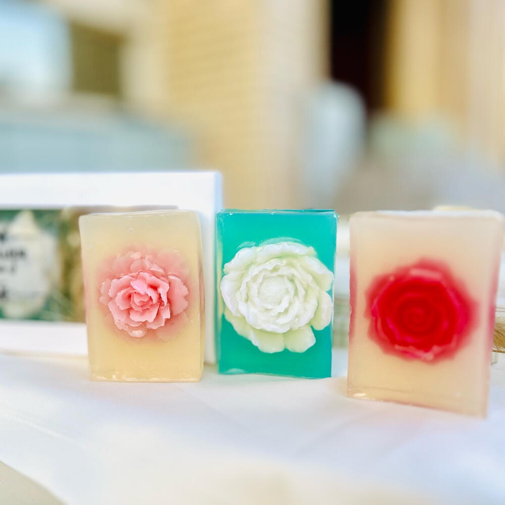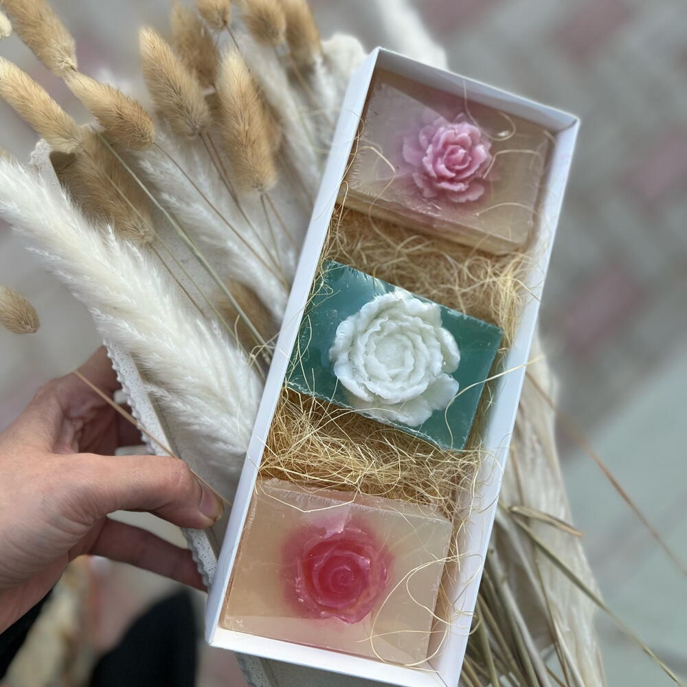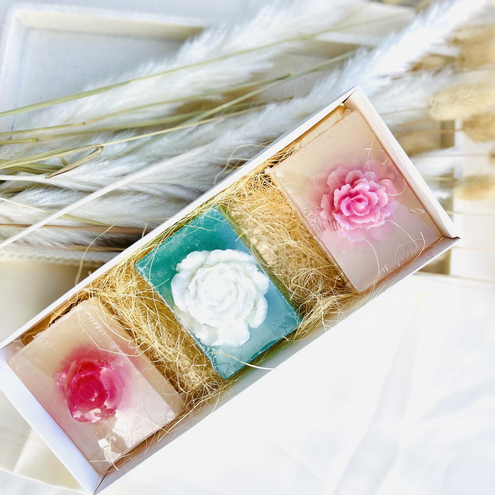 Embrace the magic of exquisite self-care with our handmade glycerine soap. These gentle moisturizing bars are crafted with love, taking your bathing experience to a whole new level of luxury. It produces a rich, creamy lather that cleanses your skin while enveloping you in a whisper of delicate fragrance. Made solely with quality glycerine, it guarantees gentle soothing for your skin, leaving it feeling soft, hydrated, and refreshingly clean. Indulge in spa like experience every time you lather up! Crafted for the discerning lover of luxury soaps, make this beautiful handmade glycerine soap a part of your beauty essentials. 100 grams per bar The gift set includes 3 hand made soaps - velvet rose - jasmine - peonies Ingredients: Coconut oil Castor oil Sunflower oil Glycerine Stearic acid Lye Skin safe fragrance and colorant