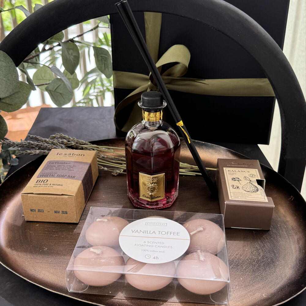 Bring warmth and serenity into your space with our Amber Harmony gift box A curated sensory experience designed to uplift the mood and soothe the soul. This elegant set is perfect for cozy self-care moments, thoughtful thank-you gifts, or elevating any home atmosphere. What’s inside (4 pieces): • Reed Diffuser (Amber & Leather scent – 120ml) • Scented Floating Candles (Vanilla Toffee – 6 pcs) • Lavender Natural Soap Bar (Bio Soap) • Balance Essential Oil for Burner (aromatherapy blend) Beautifully presented in a premium gift box (black or white), tied with an olive ribbon blending charm, fragrance, and relaxation in every detail.