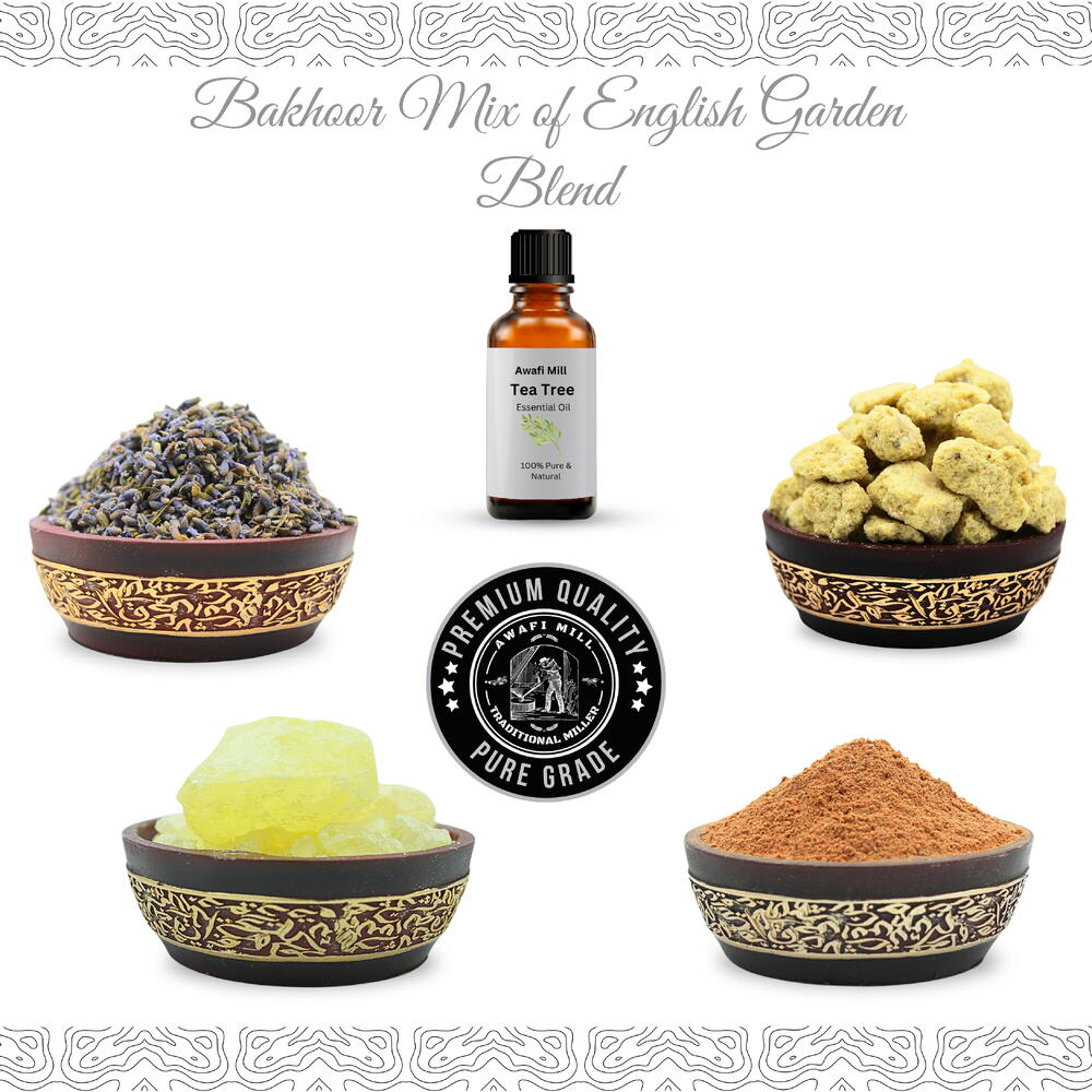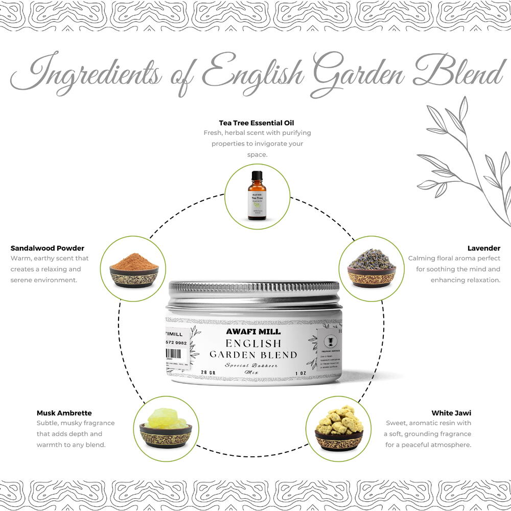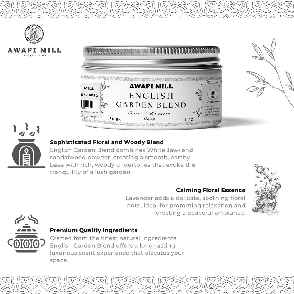 AWAFI MILL presents the English Garden Blend Bakhoor Mix, a premium incense blend that combines the finest natural ingredients to create a peaceful and refreshing aroma. Featuring White Jawi, Sandalwood Powder, Lavender, Musk Ambrette, and Tea Tree Essential Oil, this expertly crafted mix is perfect for filling your space with a calming and serene fragrance. Global Inspiration: United Kingdom: Inspired by the fresh and floral fragrances of an English garden, this blend captures the essence of tranquil outdoor spaces. Middle East: White Jawi and Sandalwood Powder bring ancient aromatic traditions with their grounding and purifying properties. Europe: Lavender and Tea Tree Essential Oils provide calming, refreshing notes, promoting relaxation and well-being. Benefits and Usage: Purifies the Air: This incense mix helps purify the air, filling your environment with a calming, fresh aroma. Promotes Calm and Relaxation: Ideal for meditation, relaxation, or enhancing any room with its soothing scent. Perfect for Home and Office: Enhance your space with a refreshing and serene fragrance that brings tranquility to your surroundings. Great for Aromatic Rituals: Use during spiritual rituals, prayer ceremonies, or simply to create a peaceful atmosphere at home. How to Use: Prepare a heat-resistant burner or charcoal. Light the charcoal until it is hot. Place a small amount of the English Garden Blend Bakhoor Mix on the hot charcoal or an electric burner. Enjoy the calming and refreshing aroma as it fills your space.