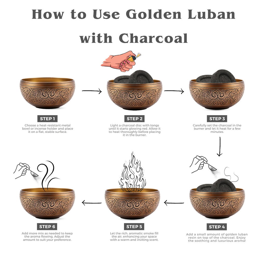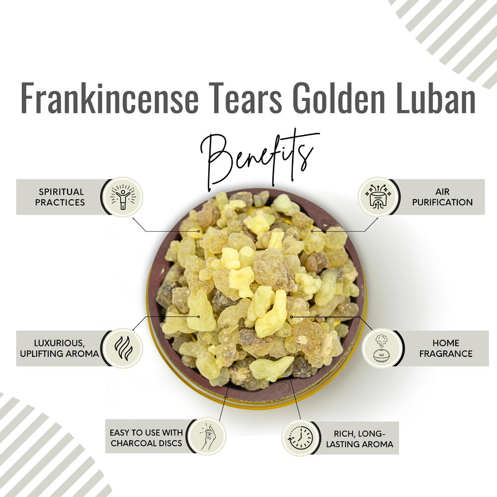 Golden luban frankincense tears, known for their purity and high-quality resin Immerse yourself in the enchanting fragrance of our frankincense tears, Releasing aromatic smoke that elevates any space Each package includes a complimentary charcoal tablet