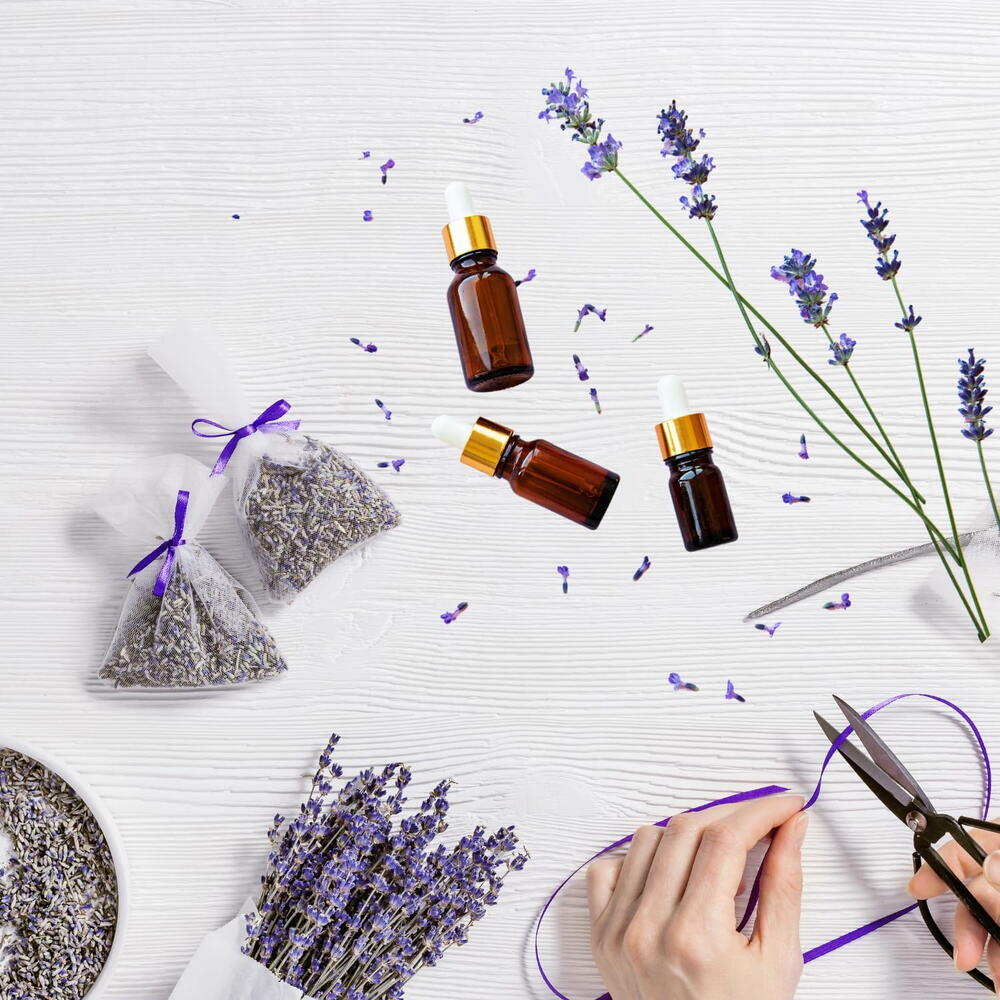 Lavender sachet set featuring natural dried flower scents. Natural lavender essential oil for an authentic and soothing fragrance. Perfect for placing in drawers, closets, or small spaces to add a refreshing scent. Enjoy the calming and aromatic essence of lavender without the use of synthetic fragrances.