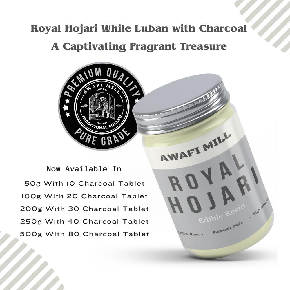 Indulge in the opulence of AWAFI MILL Edible Royal Hojari Gum Luban Frankincense, sourced from the sacred Boswellia Sacra trees of Oman. Known for its premium quality, this Frankincense serves a dual purpose – as a culinary delight and a captivating incense ingredient. Elevate your culinary experiences by adding a touch of luxury to your dishes and beverages with our Edible Frankincense. Beyond its culinary uses, this premium resin serves as an excellent incense ingredient, releasing a delightful fragrance when burned. To enhance your rituals, each package includes a complimentary charcoal tablet, making it convenient for you to enjoy the aromatic experience of burning Frankincense. Our Edible Royal Hojari Gum Luban Frankincense is authentically sourced from Oman, ensuring the highest quality and purity. Immerse yourself in the essence of luxury and tradition with AWAFI MILL.
