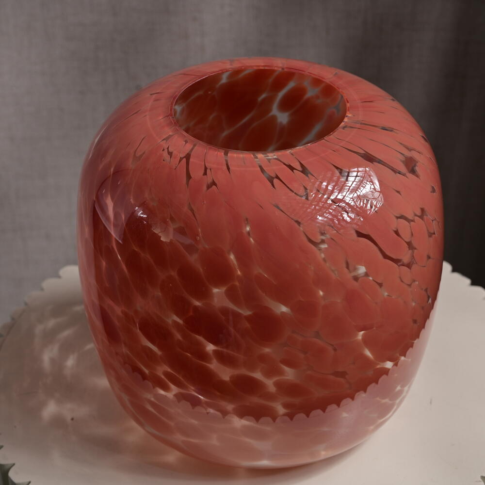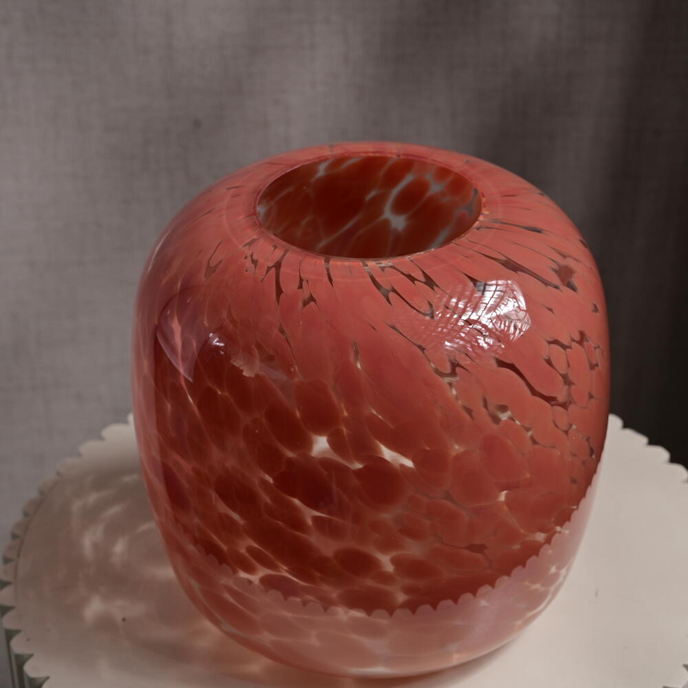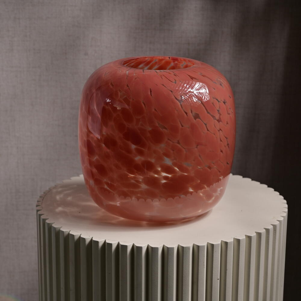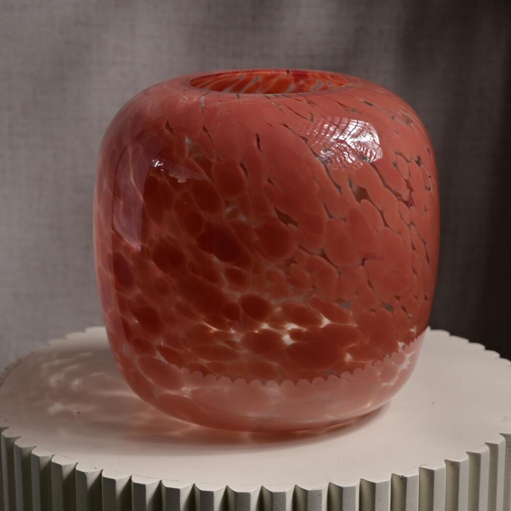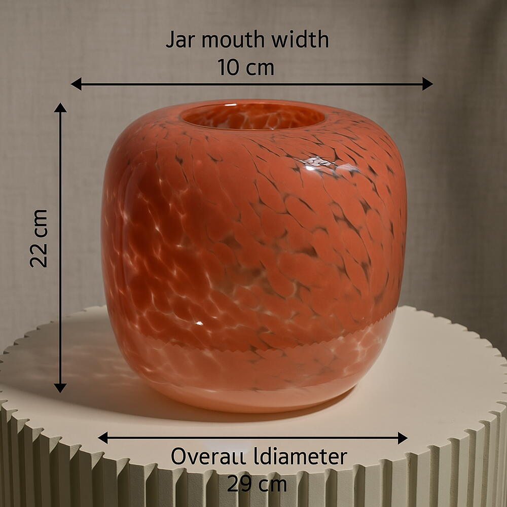 The coral-speckled glass jar features a smooth, glossy surface, showcasing a captivating color gradient from deep coral to lighter tones. Height: 22 cm Jar Mouth Width: 10 cm Overall Diameter: 29 cm