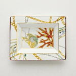 A refined rectangular porcelain tray inspired by Portofino, one of the most iconic gems of the Mediterranean and a symbol of luxury, refinement, and well-being. The design celebrates the beauty of the sea through intricate decorative elements where precious jewels, pearls, and golden ornaments intertwine and transform into marine motifs. Coral branches, delicate fish, and shell-inspired details create a sophisticated composition that evokes the charm and elegance of Mediterranean coastal life. Crafted from high-quality porcelain with luminous finishes, the tray combines artistic beauty with everyday functionality. Perfect for holding jewelry, keys, or small accessories, it also works as a decorative accent that adds a touch of seaside elegance to any interior. Its refined design reflects the harmony between luxury craftsmanship and nature-inspired creativity. To maintain its beauty, clean gently with a soft cloth or mild soap and avoid abrasive materials.