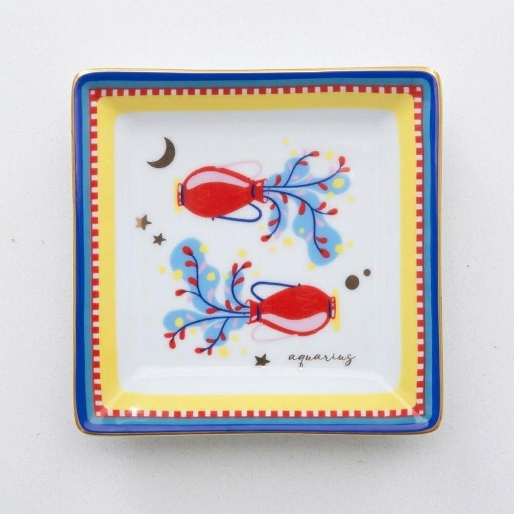 Square porcelain tray from the refined Zodiac Vibe collection, a poetic journey through astrology that celebrates the beauty and mystery of the cosmos with style and sophistication. This piece is dedicated to the Aquarius zodiac sign, symbolized by two flowing vessels pouring water, representing creativity, freedom, and a forward-thinking spirit. Surrounded by delicate celestial elements such as stars and a crescent moon, the design evokes innovation, intuition, and a deep connection with the universe — qualities traditionally associated with Aquarius. The vibrant color palette, blending bold reds with soft blues, yellows, and turquoise tones, creates a lively and harmonious composition, while the geometric border adds a contemporary decorative touch. Crafted from fine porcelain with luminous finishes, this tray combines artistic elegance with everyday functionality. Perfect for holding jewelry, coins, or small personal items, it also serves as a distinctive decorative accent that brings originality, color, and a touch of cosmic inspiration into any space.