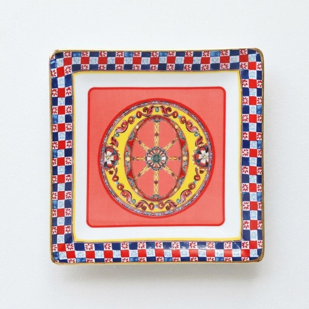 A refined pocket emptier from the sumptuous Ortigia collection, inspired by the vibrant culture and timeless traditions of Sicily. Ortigia, the historic heart of Syracuse, is celebrated for its rich colors, artistic heritage, and Mediterranean charm — elements beautifully reflected in this decorative porcelain tray. The design features a central ornamental medallion inspired by classical Sicilian motifs, surrounded by intricate details and framed by a lively geometric border reminiscent of traditional majolica tiles. The harmonious combination of red, blue, and golden tones creates a dynamic yet elegant composition full of personality and warmth. Crafted from fine porcelain with luminous finishes, this tray combines artistic beauty with everyday practicality. Ideal for holding keys, jewelry, coins, or small personal items, it also serves as a decorative accent that brings a touch of Mediterranean elegance and character to any interior.