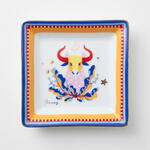 Square porcelain tray from the refined Zodiac Vibe collection, a poetic journey through astrology that celebrates the beauty and mystery of the cosmos with style and sophistication. This piece is dedicated to the Taurus zodiac sign, represented by a stylized bull at the center of the composition. Surrounded by delicate botanical and celestial elements such as stars and a crescent moon, the design reflects strength, stability, and a deep connection with nature — qualities traditionally associated with Taurus. The harmonious palette of warm yellows, soft blues, and vibrant red accents creates a balanced and visually engaging composition, while the geometric border adds a contemporary decorative touch. Crafted from fine porcelain with luminous finishes, this tray combines artistic elegance with everyday functionality. Perfect for holding jewelry, coins, or small personal items, it also serves as a distinctive decorative accent that brings personality, warmth, and a touch of cosmic inspiration into any space.