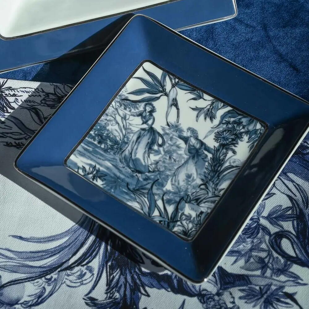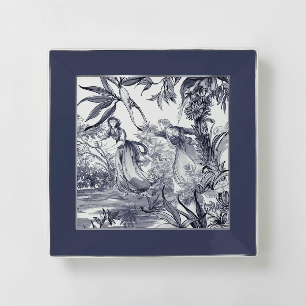 Mini tray from the elegant Versailles collection, inspired by the refined artistry and timeless sophistication of French decorative traditions. This piece features a delicate monochrome scene reminiscent of classic toile de Jouy motifs, depicting graceful figures immersed in a lush, romantic landscape. The intricate detailing and balanced composition evoke a sense of serenity and heritage, while the deep blue border frames the artwork with a bold yet refined contrast. Crafted from fine porcelain with a smooth, luminous finish, this tray embodies both decorative charm and everyday functionality. Perfect for holding jewelry, keys, or small personal items, it also serves as a stylish accent piece that enhances any interior with a touch of classic elegance and artistic heritage. Ideal for those who appreciate refined design, it brings a subtle yet distinctive character to any space.