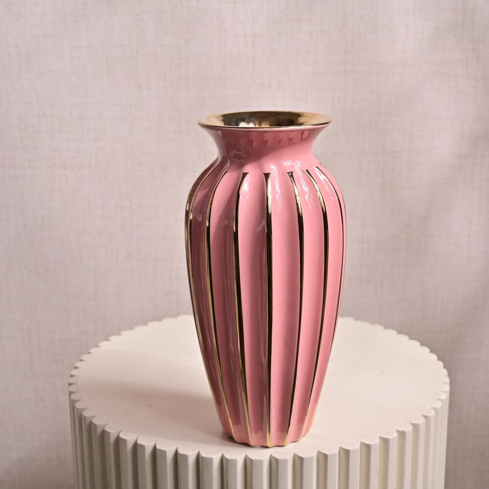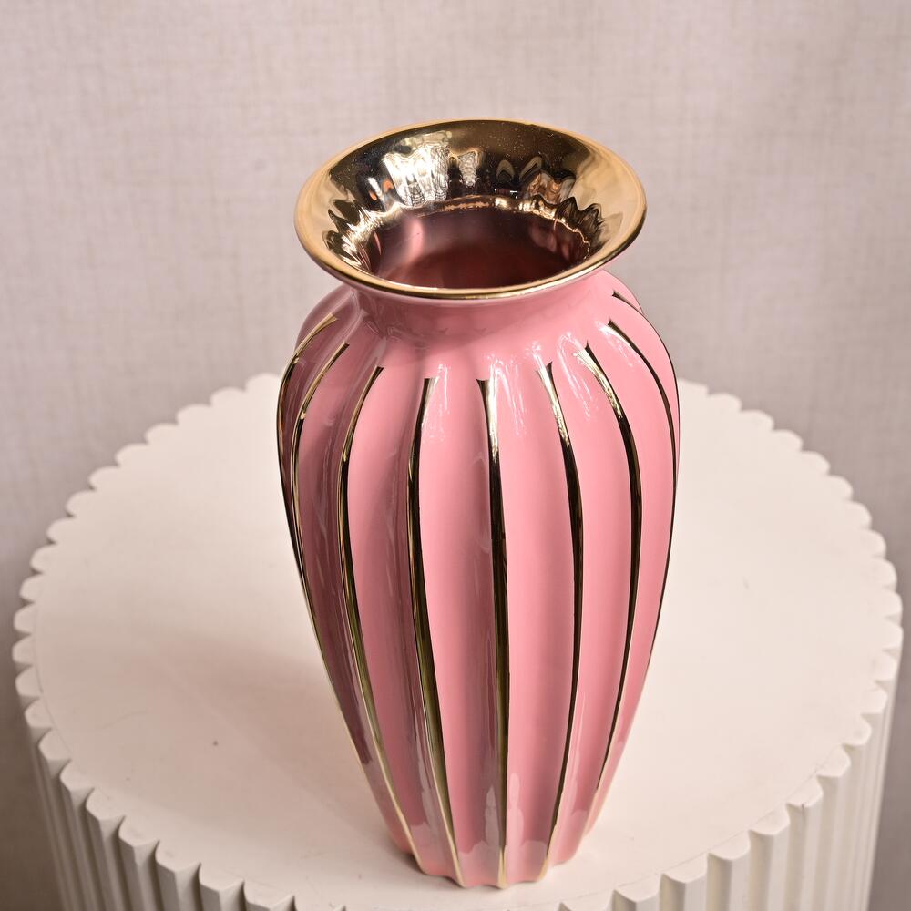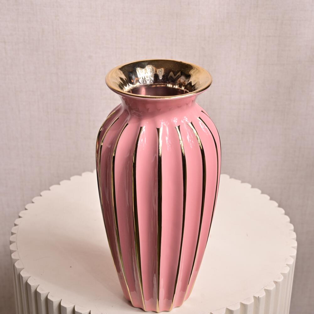 Add a vibrant touch to your home or office with this Elegant Pink Ceramic Vase with Gold Accents. The delicate pink glaze combined with the shiny gold vertical lines creates a chic and modern look. The gentle curvature of the vase’s shape and the gold rim give it a luxurious appearance, making it the perfect choice for showcasing your favorite floral arrangements or as a decorative piece on its own. Dimensions: Height: 27 cm Mouth Width: 10 cm Overall Diameter: 37 cm Material: Ceramic with a glossy pink finish and gold accents