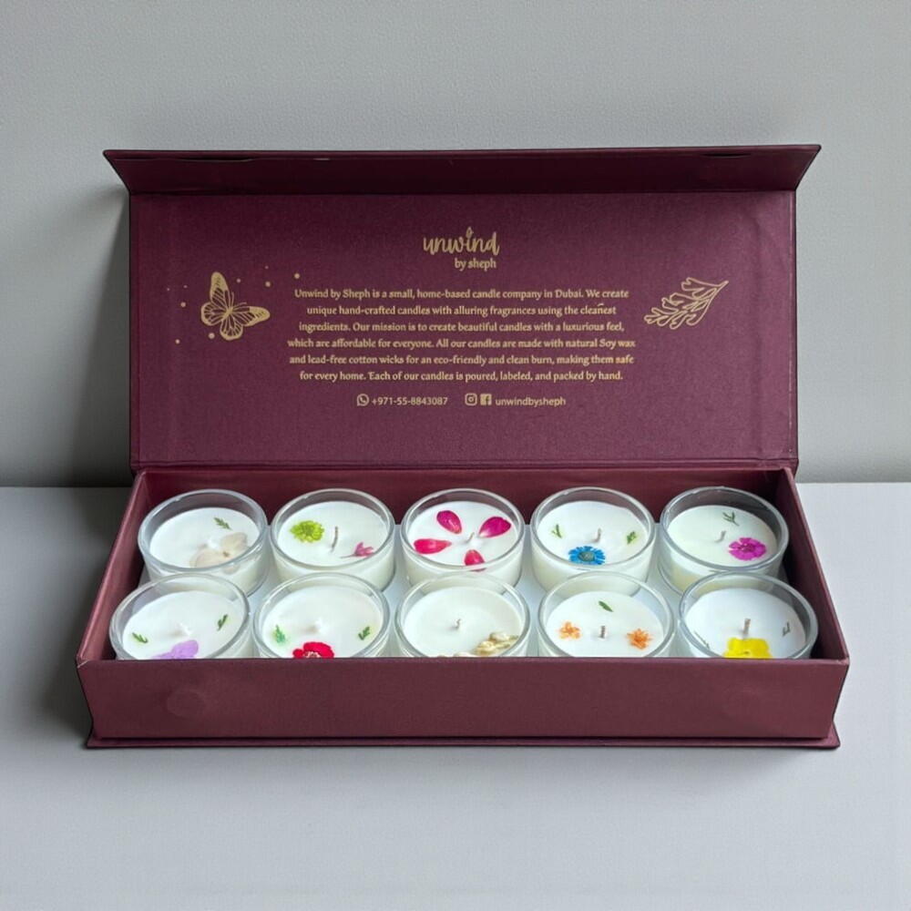 Indulge in the ultimate sensory experience with the Box of 10 Scented Candles from Unwind by Sheph. Elegantly presented in a luxurious maroon box, this collection features ten exquisite candles, each hand-poured with love and crafted from 100% natural soy wax for a clean, long-lasting burn. Each candle is adorned with delicate small flowers on top, adding a charming, natural touch to their design. Perfect for creating cozy vibes, enhancing special occasions, or gifting to loved ones, this versatile set offers a delightful variety of fragrances to suit every mood and moment.