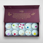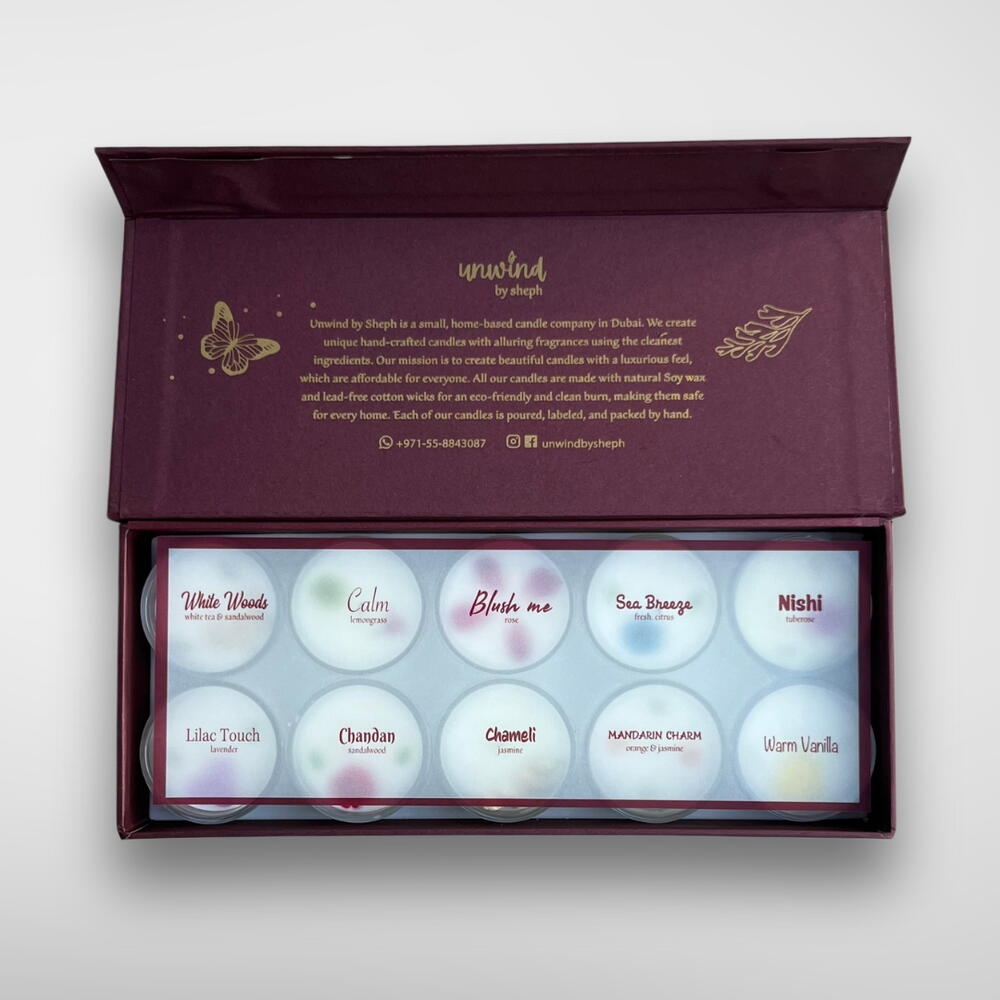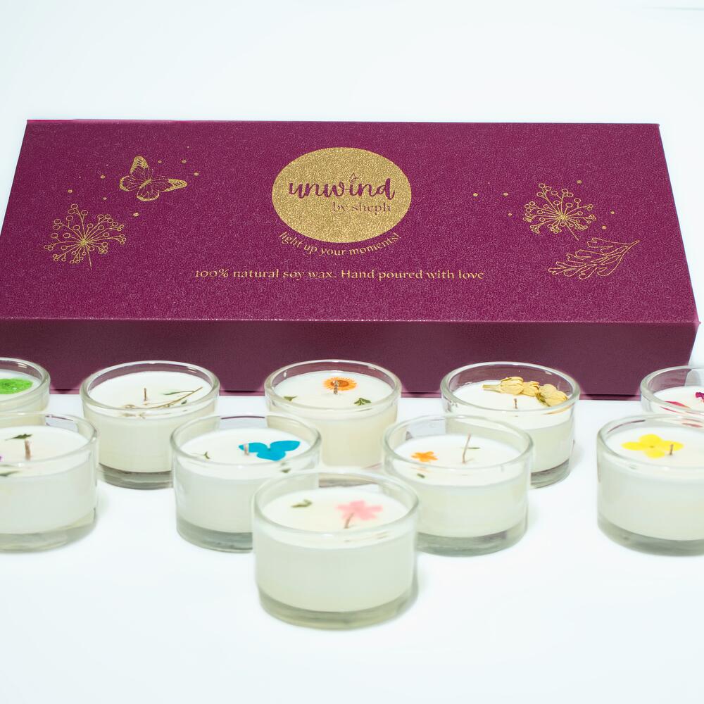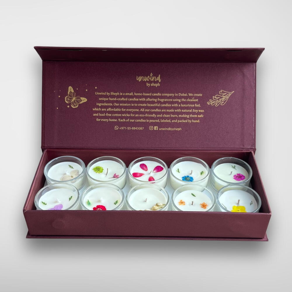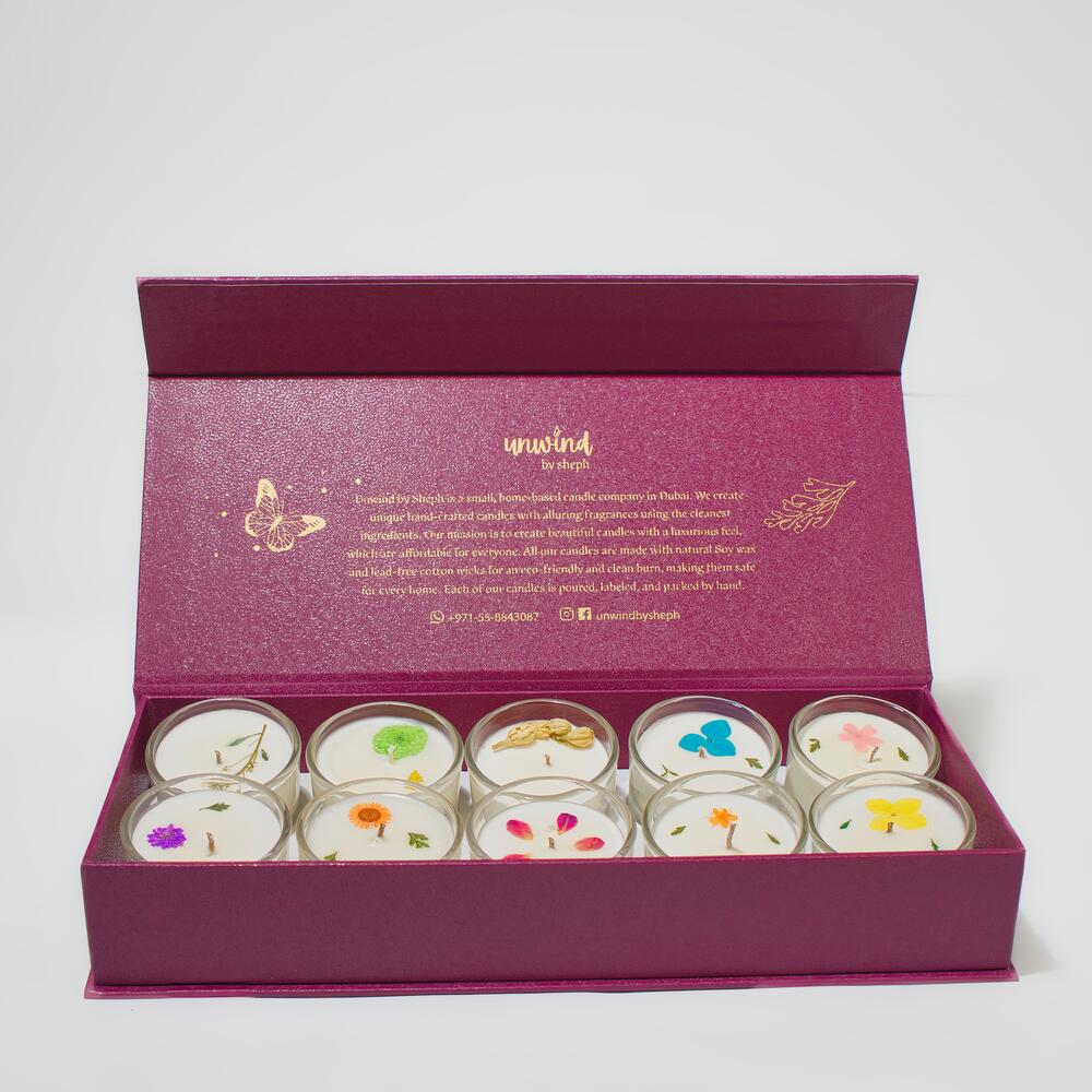 Indulge in the ultimate sensory experience with the Box of 10 Scented Candles from Unwind by Sheph. Elegantly presented in a luxurious maroon box, this collection features ten exquisite candles, each hand-poured with love and crafted from 100% natural soy wax for a clean, long-lasting burn. Each candle is adorned with delicate small flowers on top, adding a charming, natural touch to their design. Perfect for creating cozy vibes, enhancing special occasions, or gifting to loved ones, this versatile set offers a delightful variety of fragrances to suit every mood and moment.