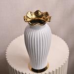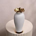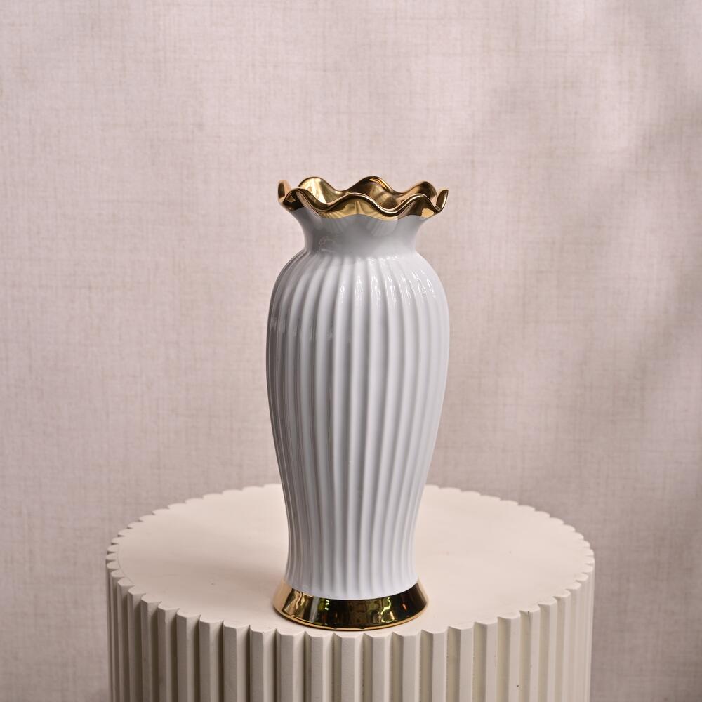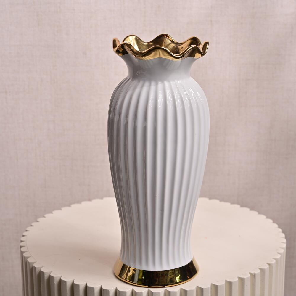 This Elegant White Ceramic Vase with Gold Rim is a beautiful fusion of sophistication and modern design. The smooth white ribbed ceramic body is enhanced by a luxurious gold rim that adds a touch of elegance. Its refined design makes it the perfect vessel for a variety of floral arrangements or as a statement piece in any living space, office, or reception area. Dimensions: Height: 29 cm Mouth Width: 11 cm Overall Diameter: 35 cm Material: Ceramic with a glossy white finish and gold accents