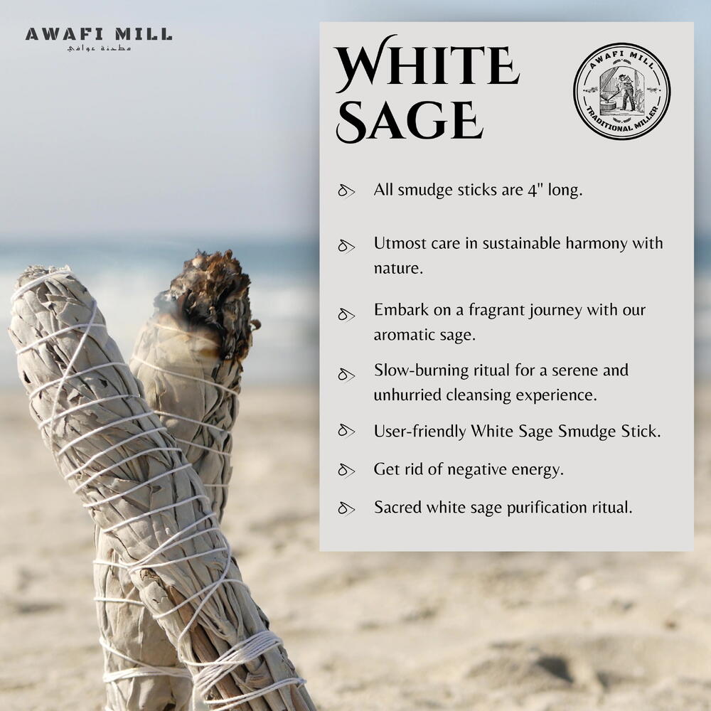 Awafi Mill introduces White Sage Smudge Sticks, carefully crafted from pure white sage leaves renowned for their cleansing and purifying properties. Embrace the power of nature to cleanse your home, promote, and enhance meditation with our authentic white sage bundles. Transform our White Sage Bundles into natural incense, filling your surroundings with positive vibes and a soothing aroma. Awafi Mill encourages the use of white sage for its aromatic qualities, promoting relaxation and a sense of well-being. Experience the healing energies of white sage during meditation sessions, enhancing your practice and creating a tranquil, focused atmosphere. Awafi Mill’s White Sage Smudge Sticks serve as a natural tool for connecting with traditions and promoting mindfulness in your daily life.