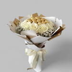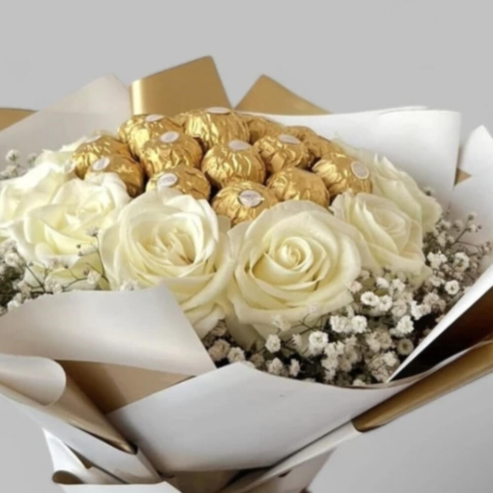 bouquet featuring white roses and small white flowers, such as babys breath or gypsophila. It also contains several gold-wrapped Ferrero Rocher chocolates. The bouquet is wrapped in white and gold paper and tied with a white ribbon.