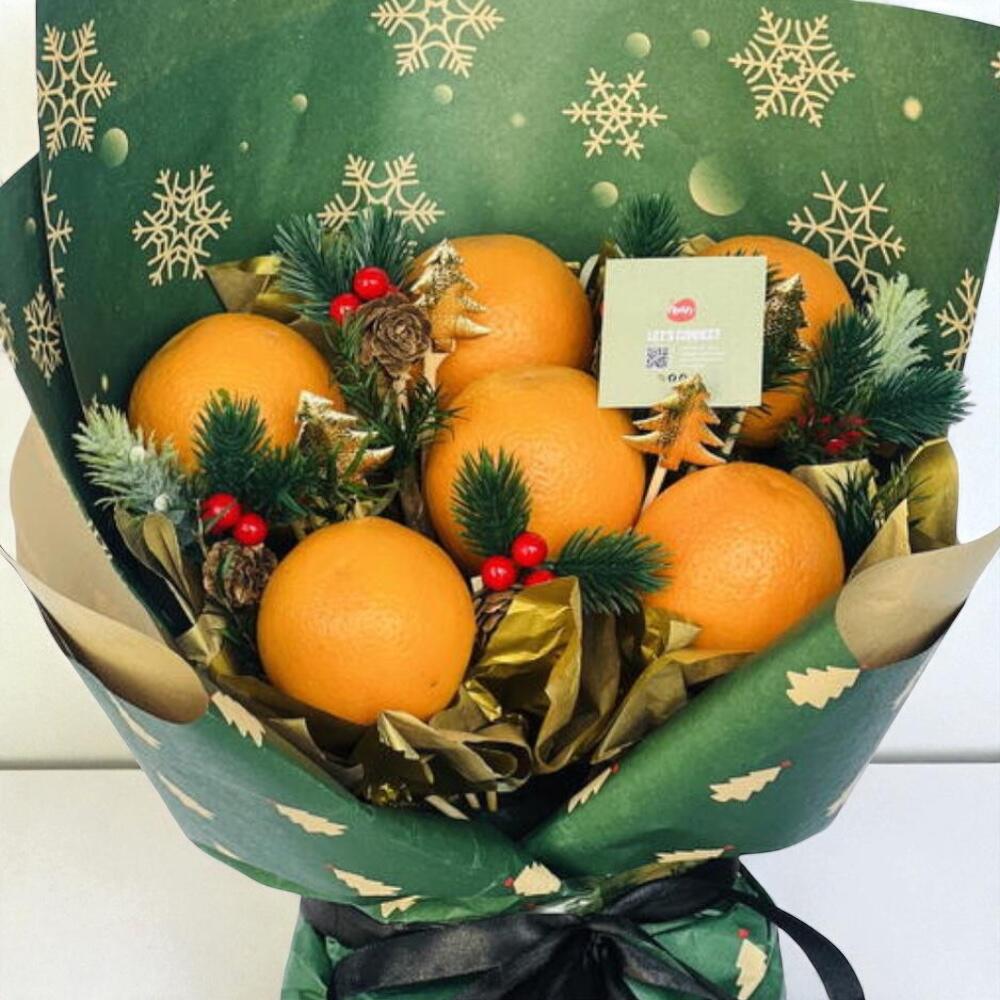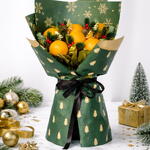 Celebrate the season with the Christmas Theme Orange Bouquet, a joyful and refreshing gift perfect for holiday gatherings and cheerful surprises. This vibrant bouquet features 6 juicy, handpicked oranges nestled among evergreen sprigs, artificial holly berries, and mini pinecones to capture the true spirit of Christmas. Wrapped in a festive green paper adorned with snowflakes and golden accents, and tied with a sleek black ribbon, this arrangement brings holiday warmth and citrus freshness together. Care Instructions: Keep the bouquet in a cool, dry place away from direct sunlight to preserve both the fruit and decorative elements. For maximum freshness, enjoy the oranges within 2–3 days of delivery. If not consumed immediately, refrigerate the fruits while keeping the decorative parts dry.