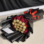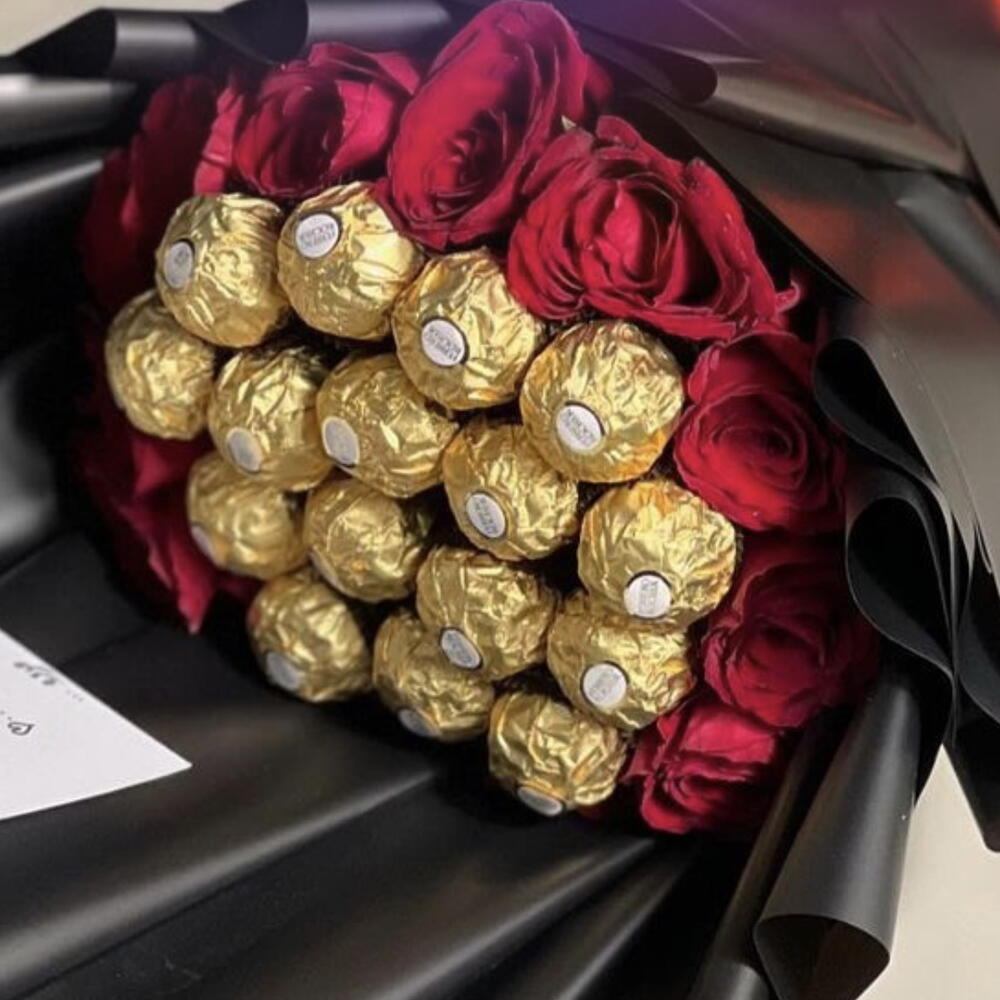 16 pcs Ferrero rocher chocolate and 10 red roses bouquet This bouquet (red roses with chocolates, elegant black wrap) is perfect for romantic and premium occasions. It fits especially well for: Romantic Occasions Valentine’s Day Anniversary Date night / Surprise for partner Proposal or engagement surprise Celebrations Birthday (for someone special) Congratulations (promotion, achievement) Graduation gift