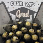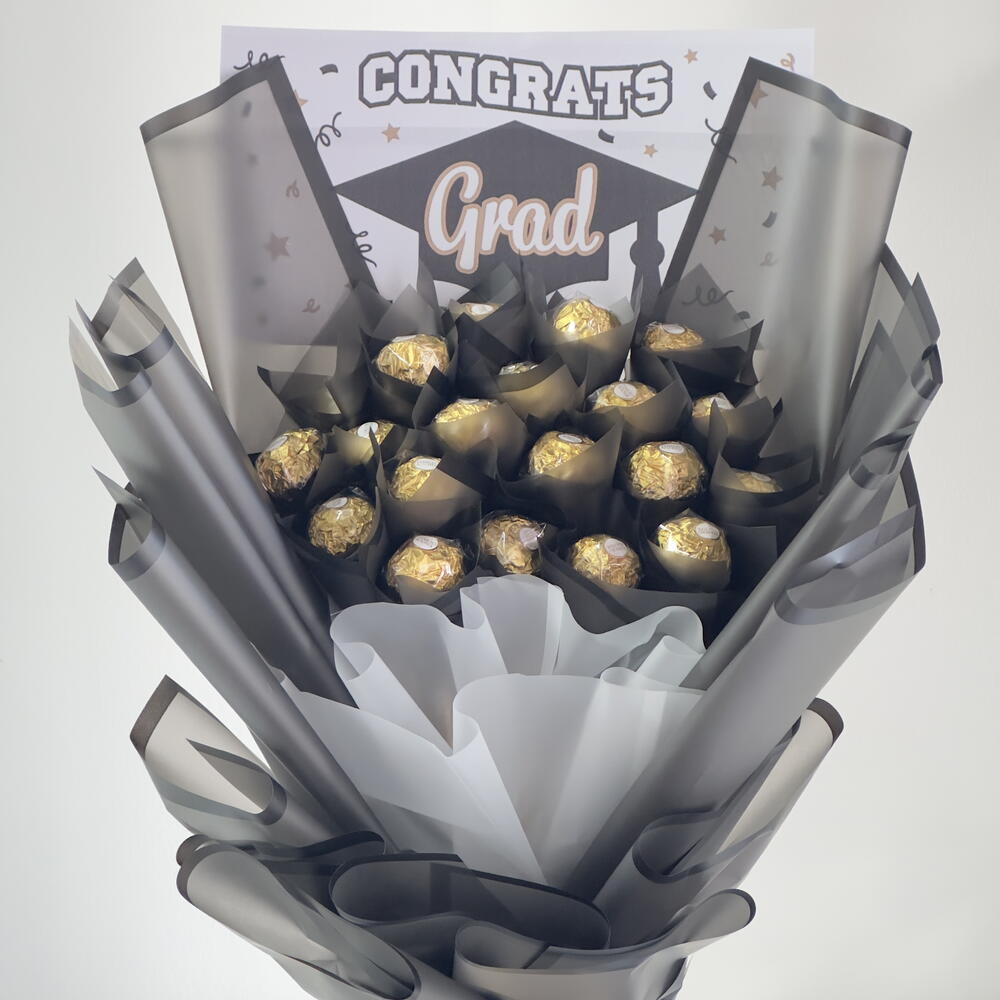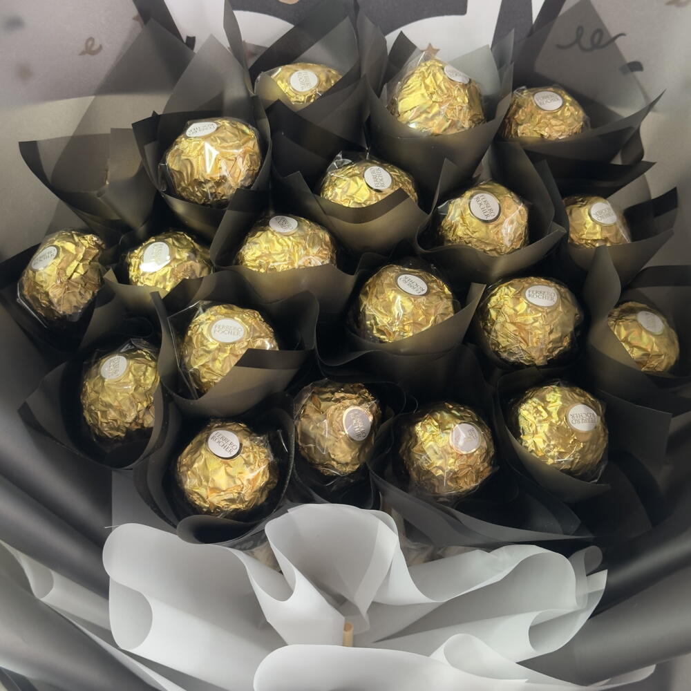 A festive bouquet of 20 Ferrero Rocher chocolates, perfectly arranged for a graduation celebration. Wrapped with style and topped with a congratulatory touch, it’s the ultimate gift to mark the moment with golden delight.