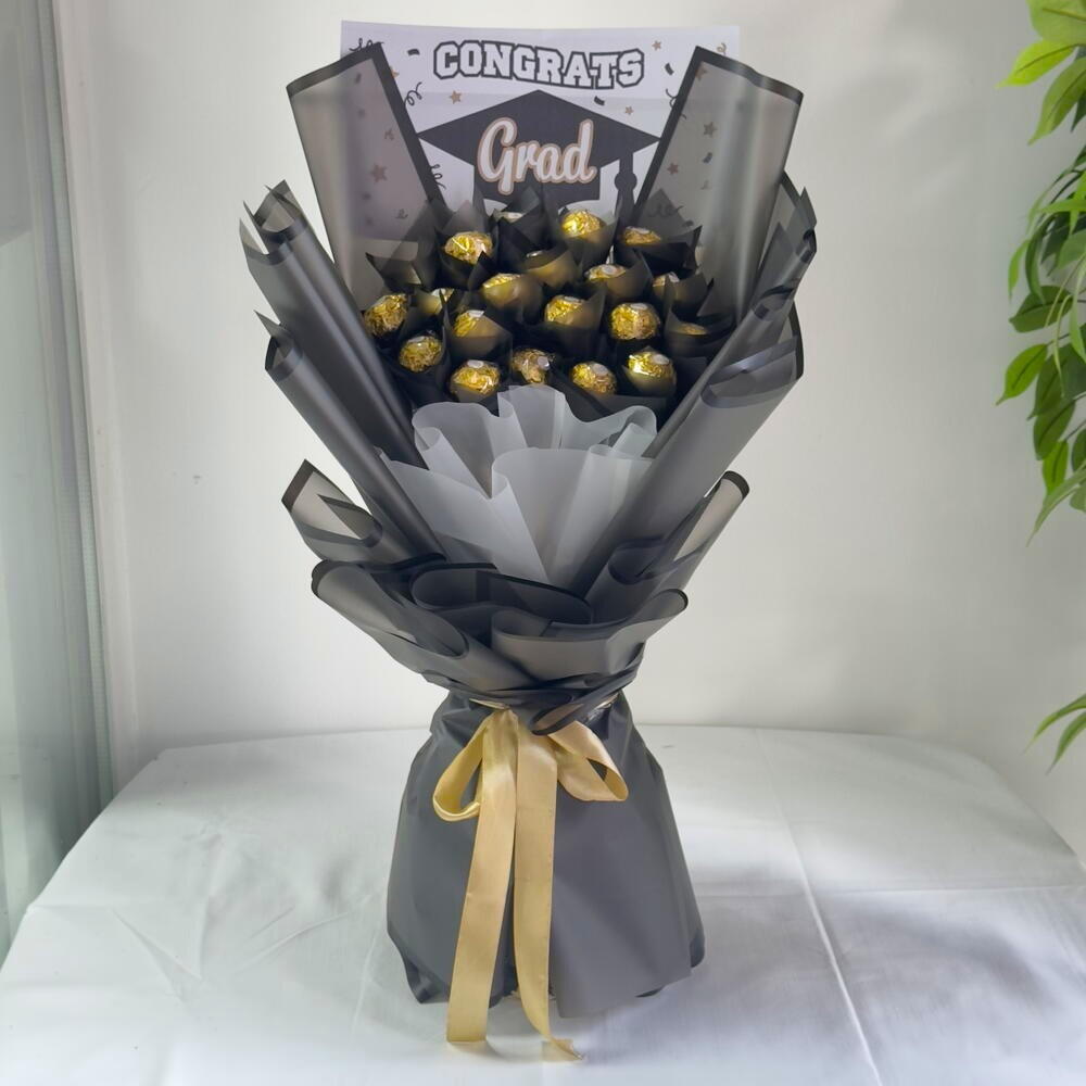 Celebrate their big milestone with this festive 21-Ferrero Rocher chocolate bouquet, beautifully wrapped and styled for any occasion. A golden, joyful gift that shines just like their achievement — elegant, memorable, and crafted to make the moment truly special. Mark their success with golden delight order RC-C615 now and gift a stunning Ferrero graduation bouquet they’ll never forget.