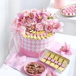 Proclaim your love with a hamper that speaks the unspeakable. Arranged in an elegant pink houndstooth box lies a beautiful array of Cymbidium orchid heads, sweet avalanche roses, and pink alstroemerias. Plush pink flowers accompany a box consisting of an assortment of nutty chocolate bites. The box can also be reused later to stylishly store knick-knacks. You can also send this hamper as a gift delivery to your friends and family for special occasions.