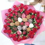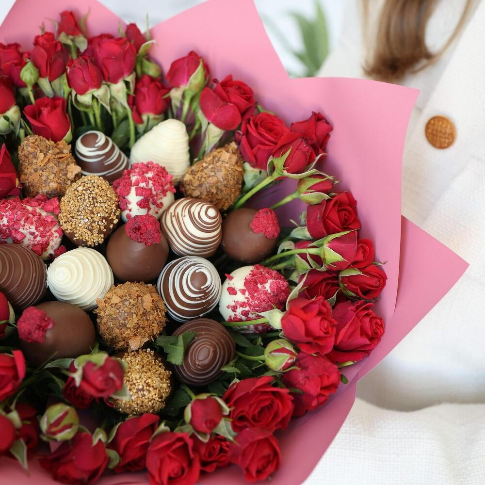 A luxurious handcrafted bouquet that combines fresh red roses with exquisite chocolate-covered strawberries the perfect gift to express love, admiration, and care. Each strawberry is freshly dipped in premium chocolate and decorated by hand, then arranged among fragrant red roses to create a stunning visual and delicious surprise in one. Ideal for birthdays, anniversaries, Valentine’s Day, proposals, or simply to make someone’s day unforgettable. Details: • Fresh red roses • Hand-dipped chocolate strawberries • Made fresh on the day of delivery • Delivered in secure, elegant packaging