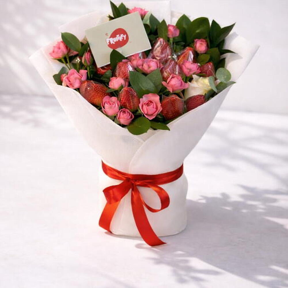 This charming bouquet includes pink roses alongside fresh strawberries. It is beautifully wrapped and adorned with a red ribbon, adding a touch of elegance. Making it a thoughtful gift for a variety of occasions. The combination of flowers and fruit offers a delightful visual appeal and can bring joy to the recipient.