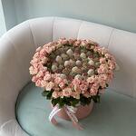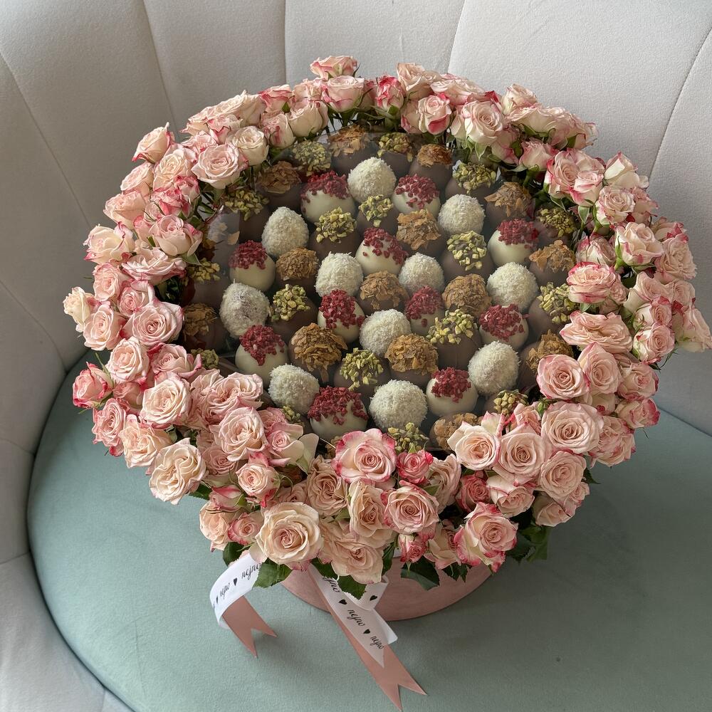 Every day we get fresh strawberries, which we temper in premium Belgian chocolate Calebaut. We do not make blanks, all compositions are prepared after the order is received. Ingredients: 60 strawberries + red spray roses. Packaging: Round box