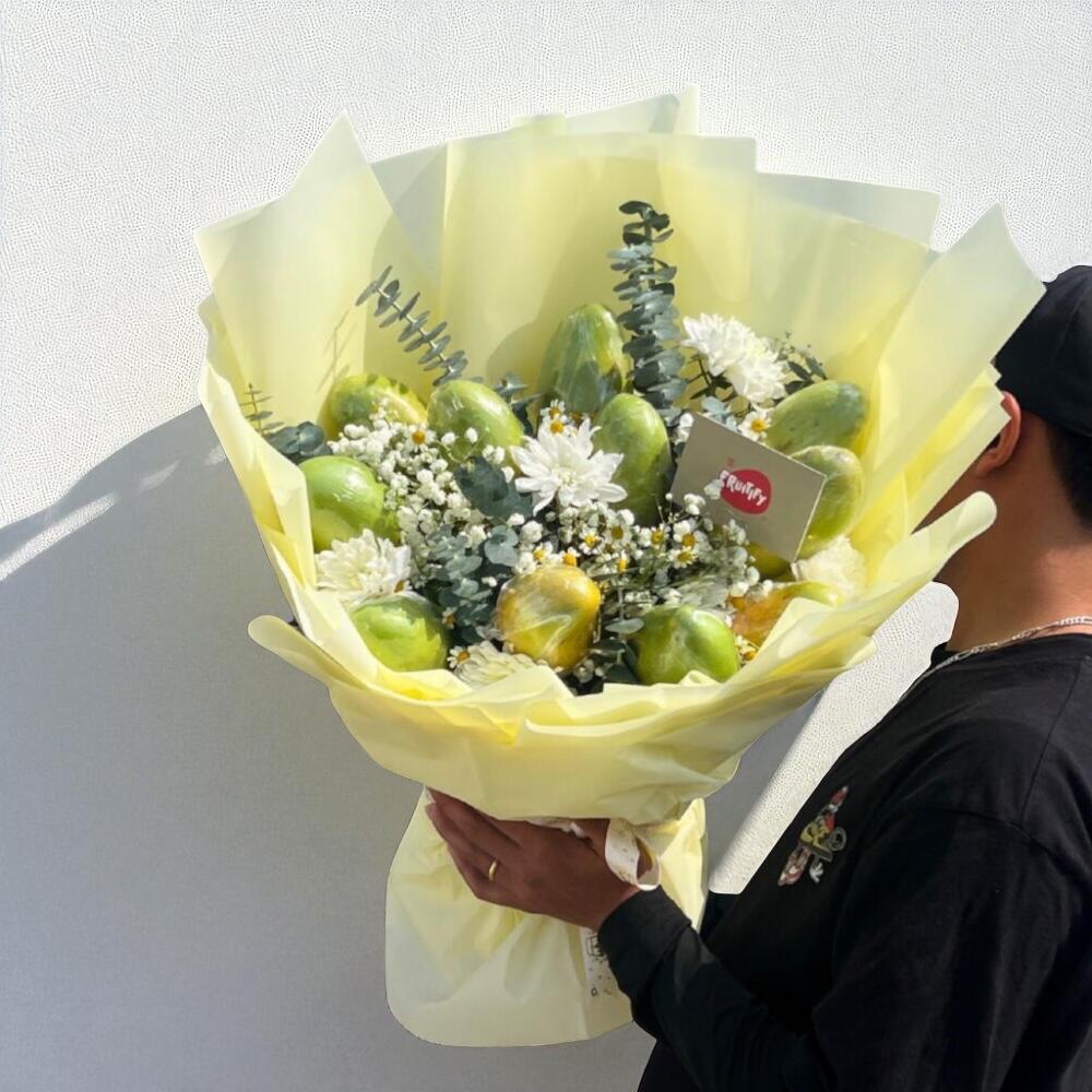 Celebrate freshness and beauty with the Seasonal Mango Flower Bouquet from Fruitify, United Arab Emirates. This one-of-a-kind edible arrangement combines the luscious sweetness of ripe mangoes with the elegance of fresh chrysanthemums, baby’s breath (gypsophila), and eucalyptus leaves. Wrapped in soft yellow floral paper, this bouquet is a delightful gift that brings together taste and style in perfect harmony. Care Instructions: Keep the bouquet upright in a cool, shaded area, and avoid direct sunlight or heat to maintain the freshness of the fruits and flowers. Mangoes can be consumed within 2–3 days; simply remove them from the bouquet and rinse before eating. Flowers are not edible but should be appreciated for their decorative beauty. Refrigeration overnight is recommended if not gifted the same day.