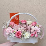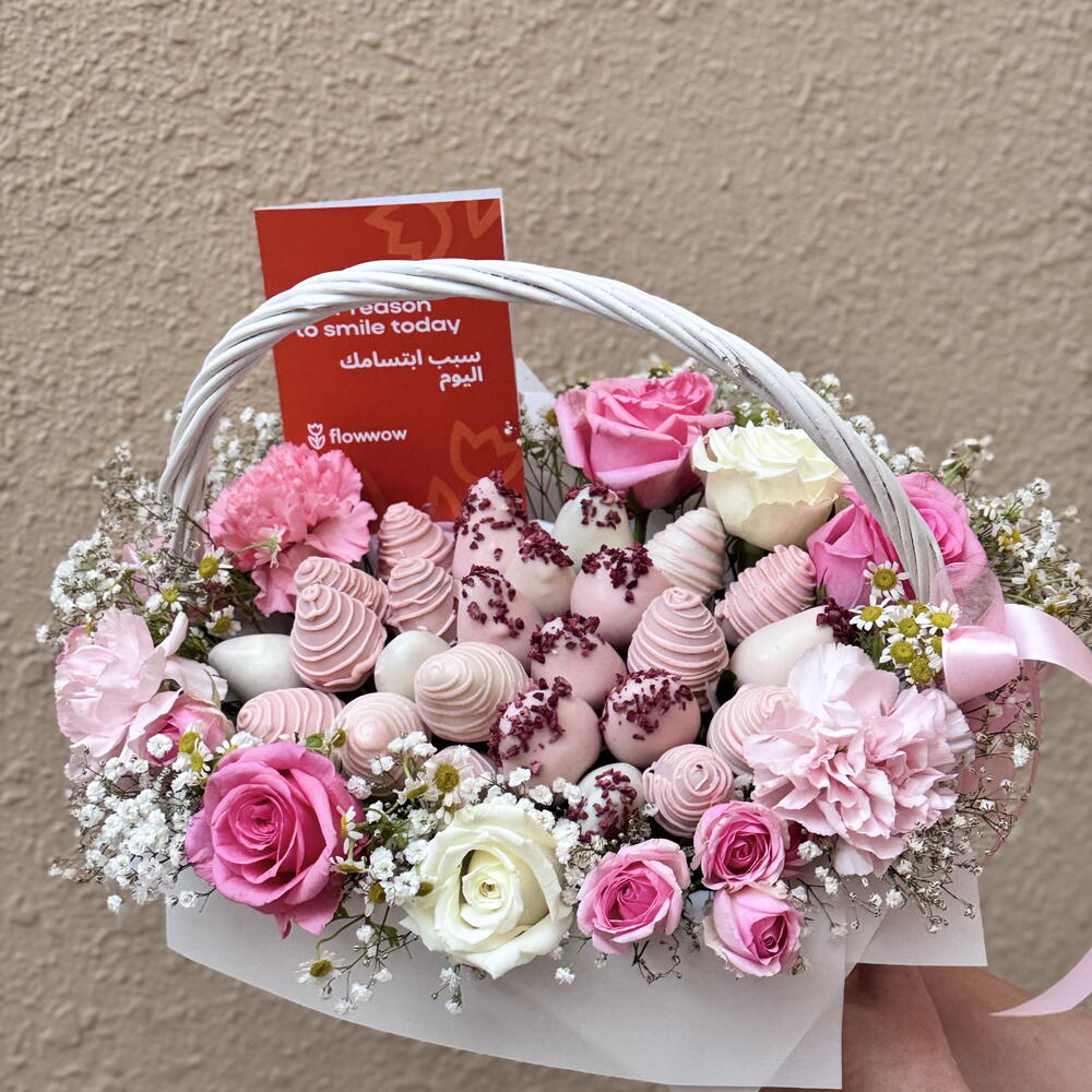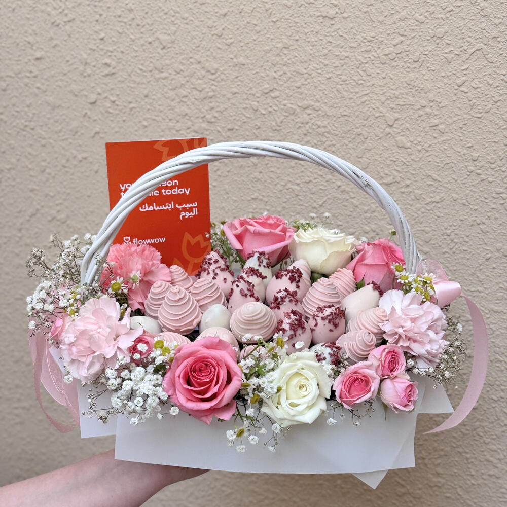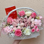 Ribbon - 2 pcs Gypsophila - 2 pcs white roses - 4 pcs roses pink - 5 pcs strawberry in chocolate - 25 pcs bucket with filling - 1 pcs