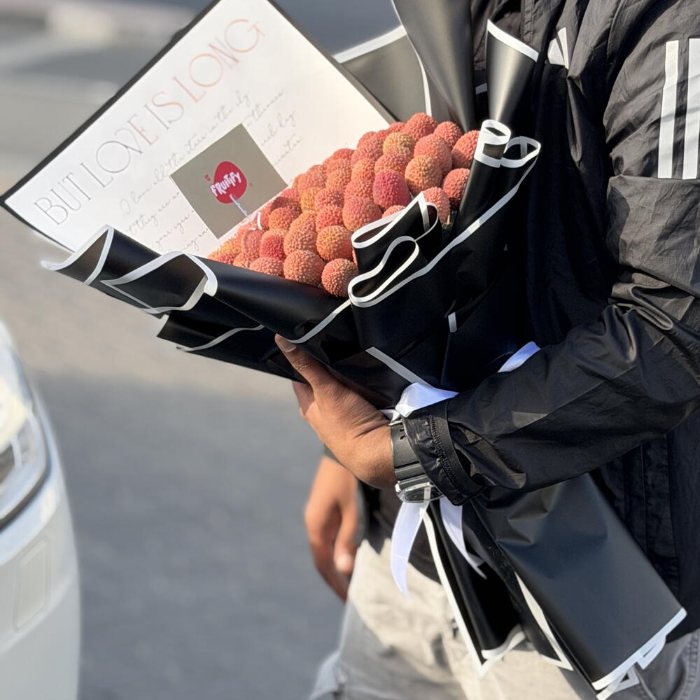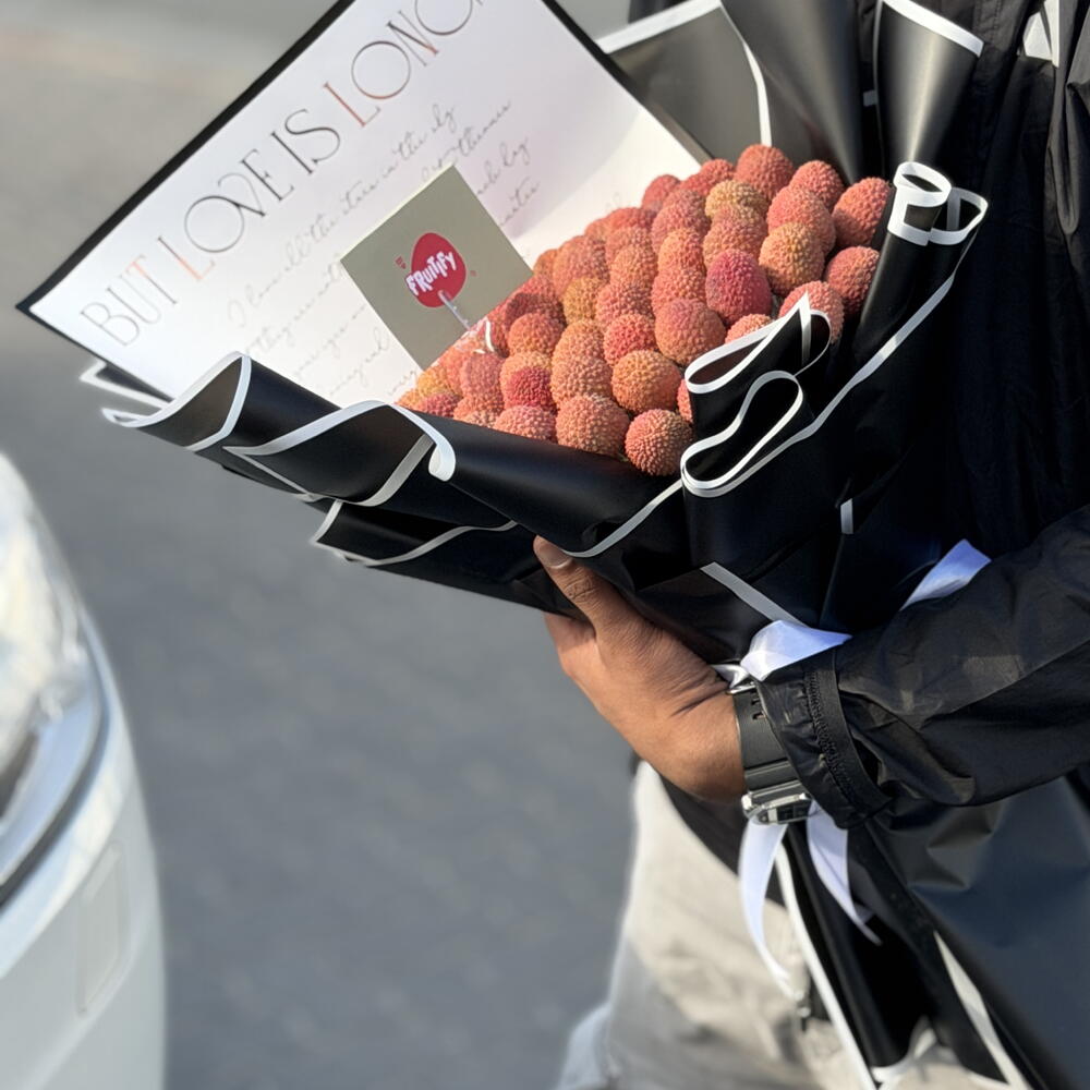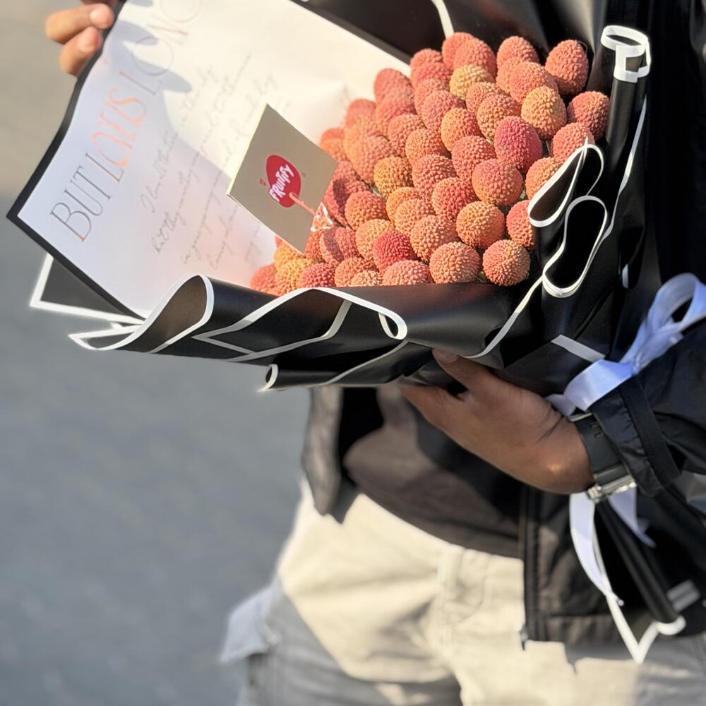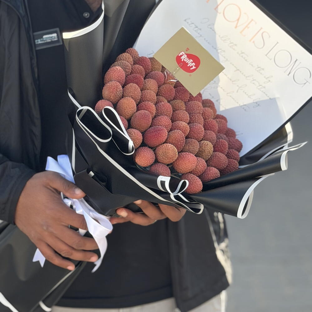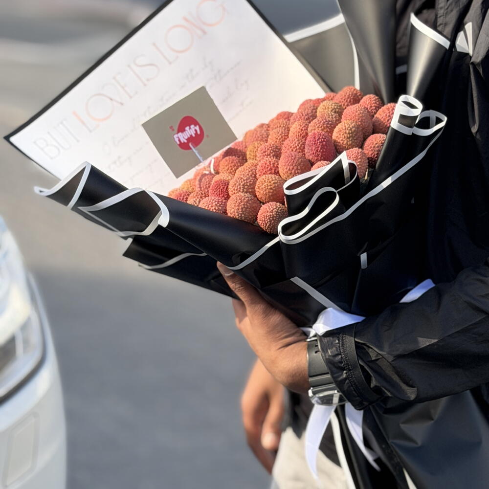 This unique gift features a lush cluster of fresh, pink-skinned lychees wrapped in elegant black and white paper. It is a modern and edible alternative to traditional flowers, perfect for someone who loves sweet treats and bold style. The bouquet combines the tropical beauty of the fruit with a sharp, fashion-forward presentation. It is hand-crafted to look like a piece of art and is designed to be shared, peeled, and enjoyed.