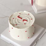 Es un hermoso pastel de temática sencilla ❤️ Aww, ¡este pastel es tan lindo! 😍 Es un pastel pequeño, redondo y blanco con glaseado en espiral encima y corazones rojos espolvoreados por todas partes. En la parte superior dice te amo con un lindo glaseado rojo. El pastel está sobre una caja blanca en una encimera de mármol. Hay otro pastel algo visible en el fondo con una cinta roja. ¡Parece un dulce para alguien especial! 💖 ¿Qué opinas?