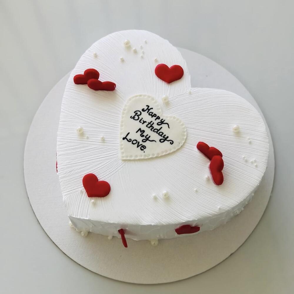 Un pastel romántico en forma de corazón, bellamente cubierto con suave crema batida blanca y decorado con delicadas perlas comestibles y vibrantes corazones de fondant rojos. El centro presenta una encantadora placa comestible con el mensaje “Feliz cumpleaños mi amor”, lo que lo convierte en la elección perfecta para expresar amor en un día especial. • Opciones de sabor: Vainilla, Chocolate, Terciopelo rojo, o Personalizado • Glaseado: Crema batida ligera y esponjosa • Decoración: corazones de fondant comestibles, perlas de azúcar, y mensaje de cumpleaños personalizado • Forma Tamaño: En forma de corazón (disponible en varios tamaños) • Ideal para: Cumpleaños, aniversarios, celebraciones románticas, o regalos sorpresa