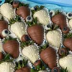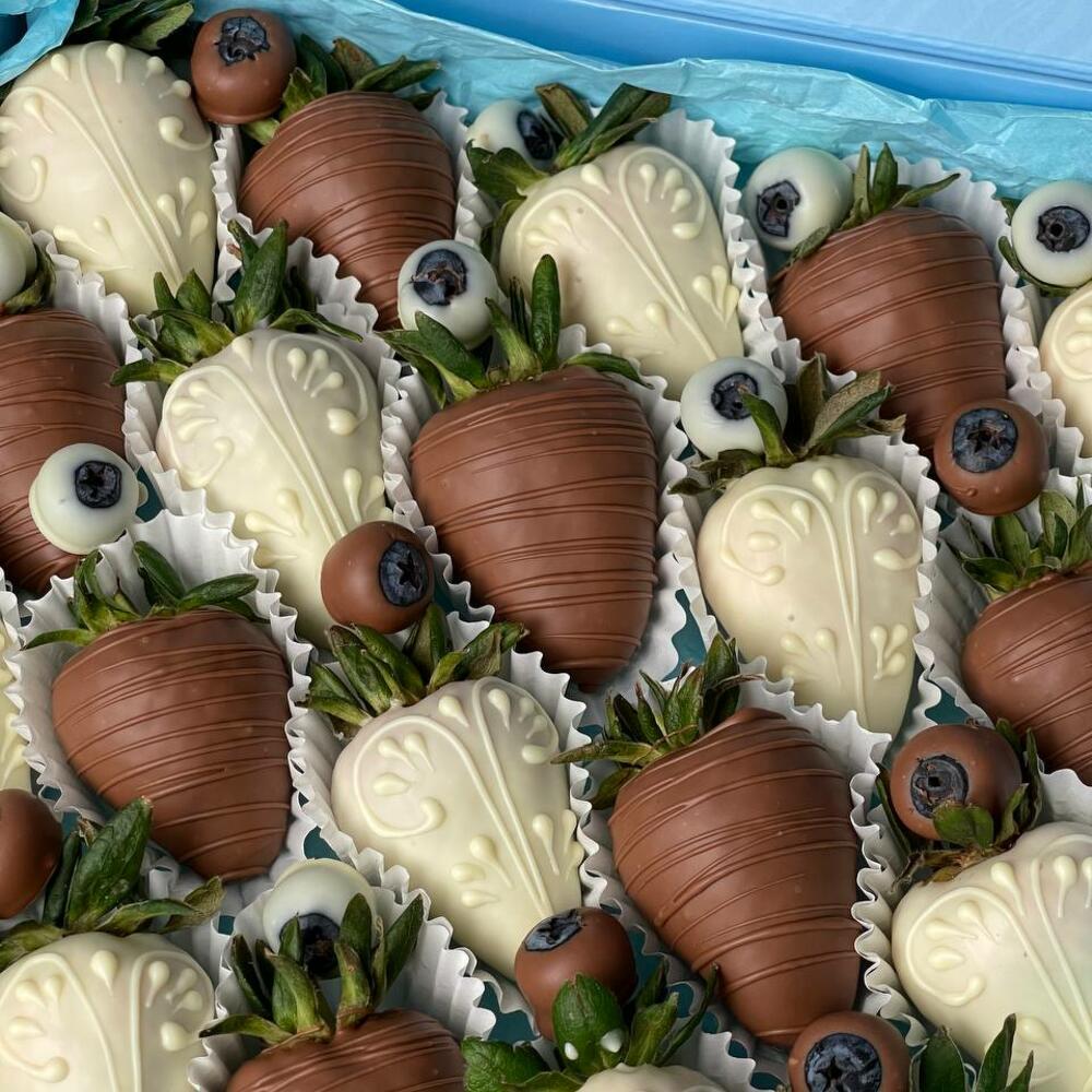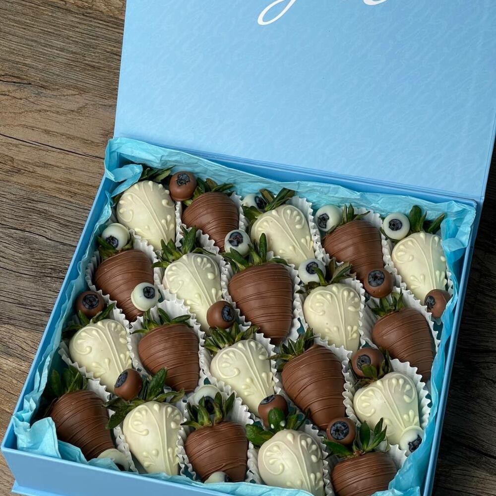 Caja azul con 20 fresas bañadas en chocolate blanco y chocolate con leche